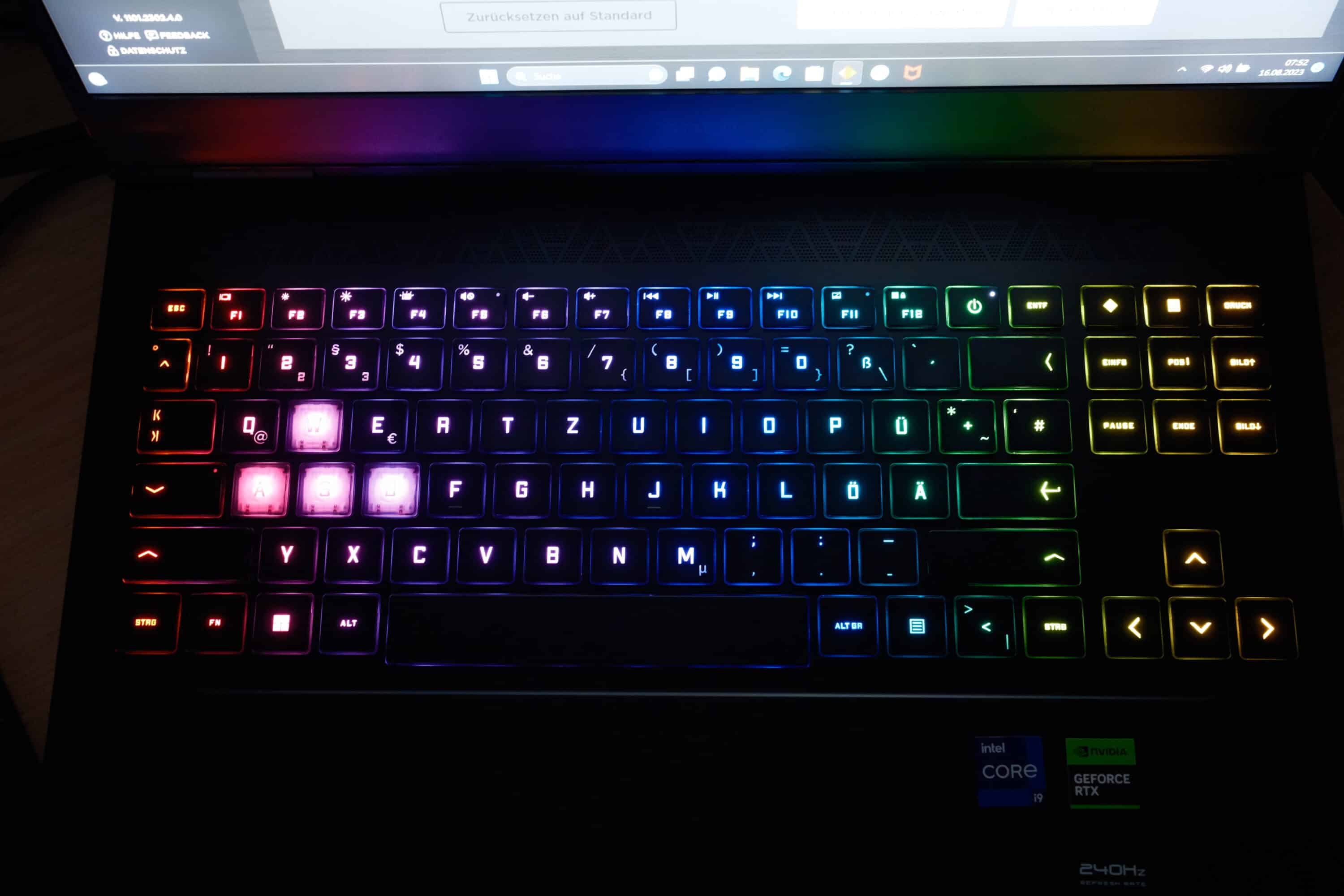 Auffällig sind vor allem die semi-transparenten WASD-Tasten, die natürlich mit aktivierter RGB-Beleuchtung besonders ins Auge stechen. Wirklich schön finde ich die Optik jedoch nicht, aber das ist sicherlich Geschmackssache.