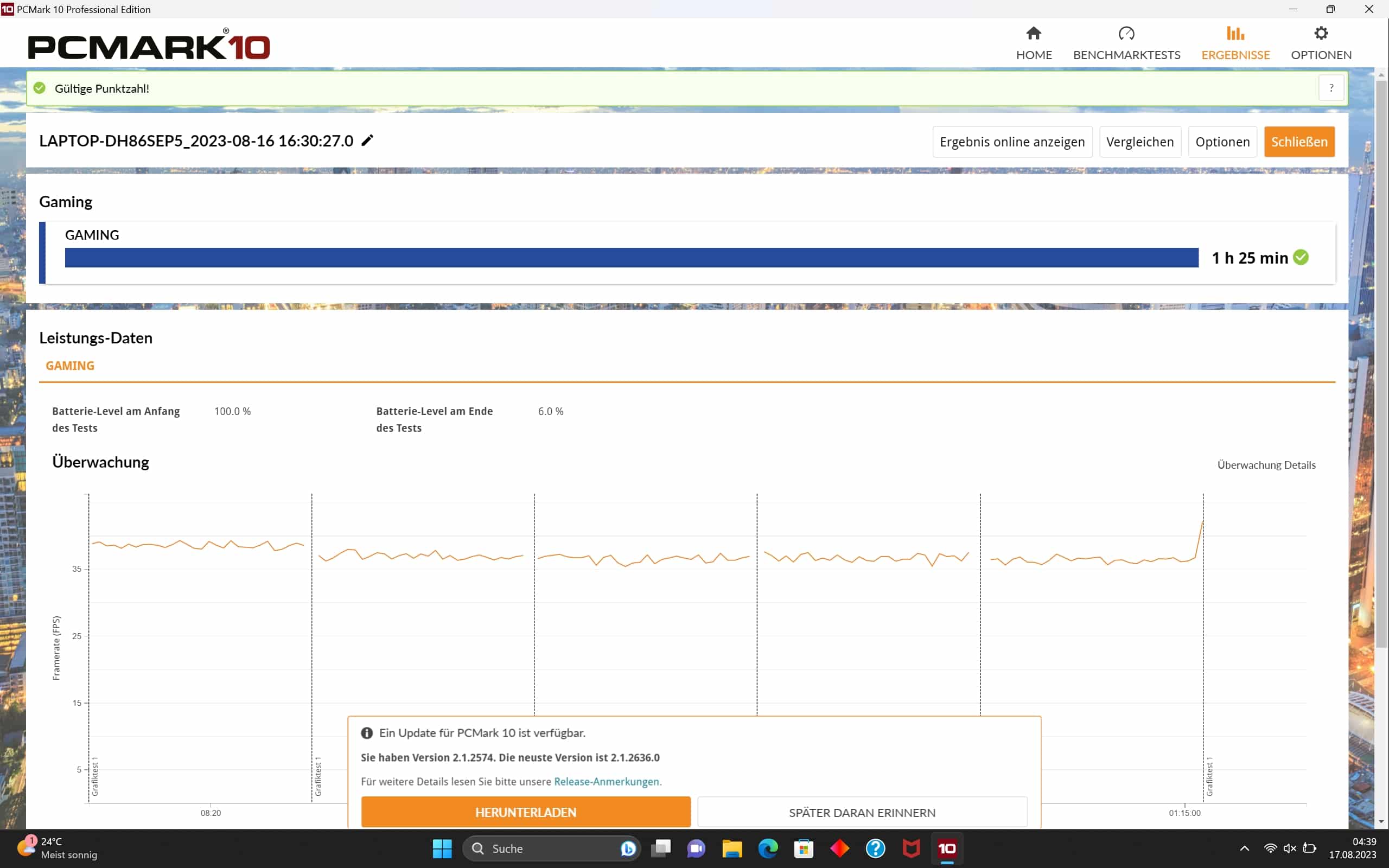 Im Gaming-Test geht dem Notebook der Saft natürlich deutlich schneller aus. Hier ist nach 1 Stunde und 25 Minuten Schluss, immerhin 30 Minuten mehr als bei Asus und 20 Minuten länger als im Omen 17.