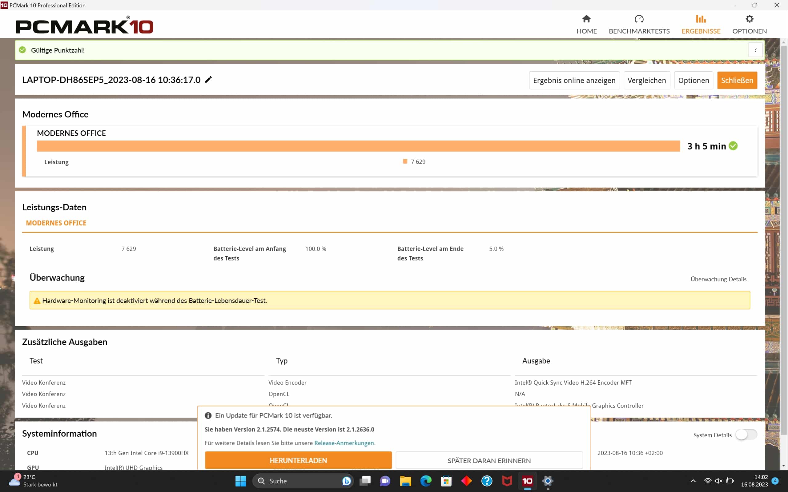 HP stattet den Omen Trascend 16 mit einem 97 Wh starken Akku aus, der gute Laufzeiten realisiert. Für ein Gaming-Notebook wohlgemerkt. Im Office-Benchmark von PCMark 10 springen am Ende 3 Stunden und 5 Minuten bei maximaler Helligkeit raus.