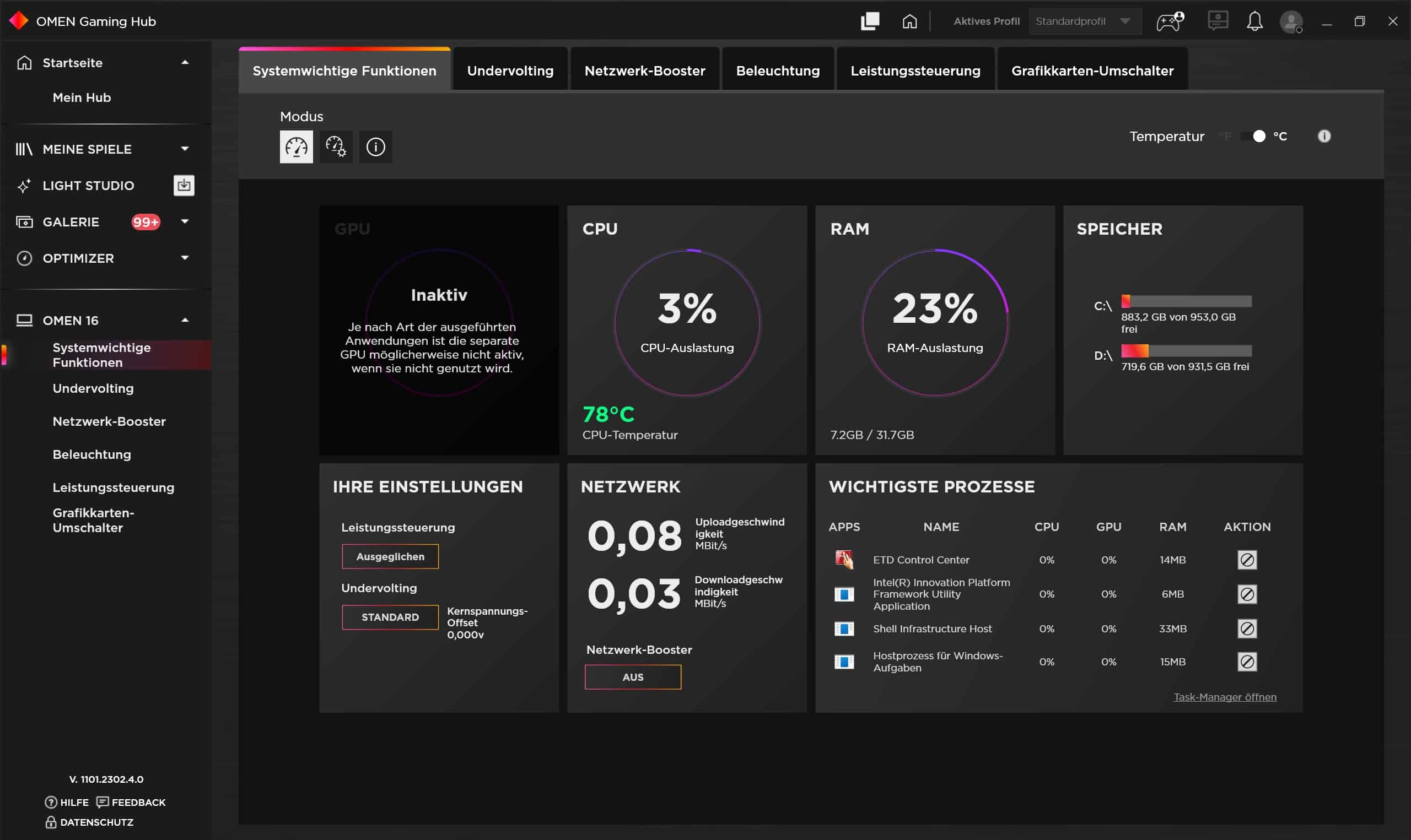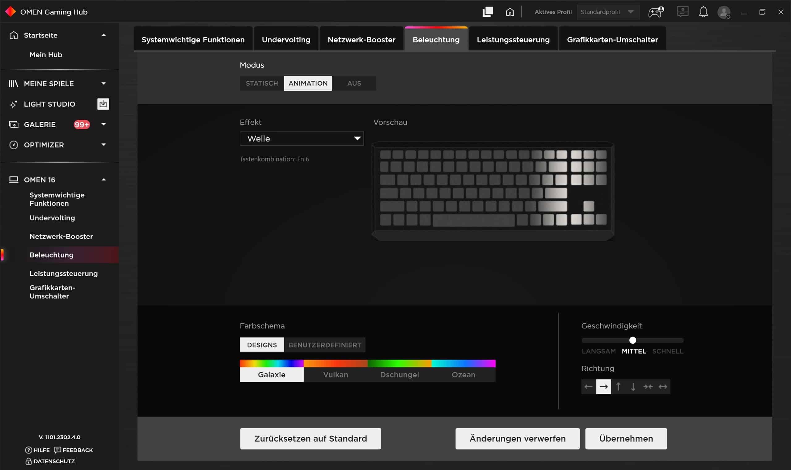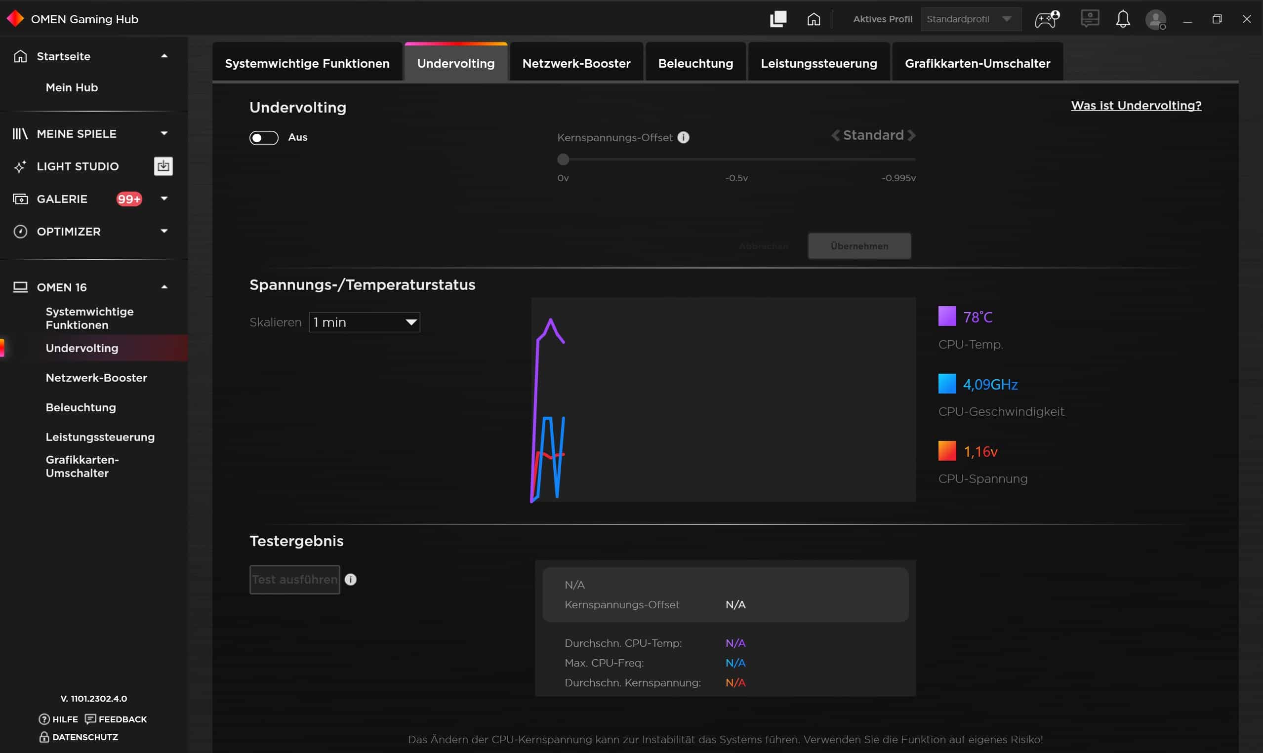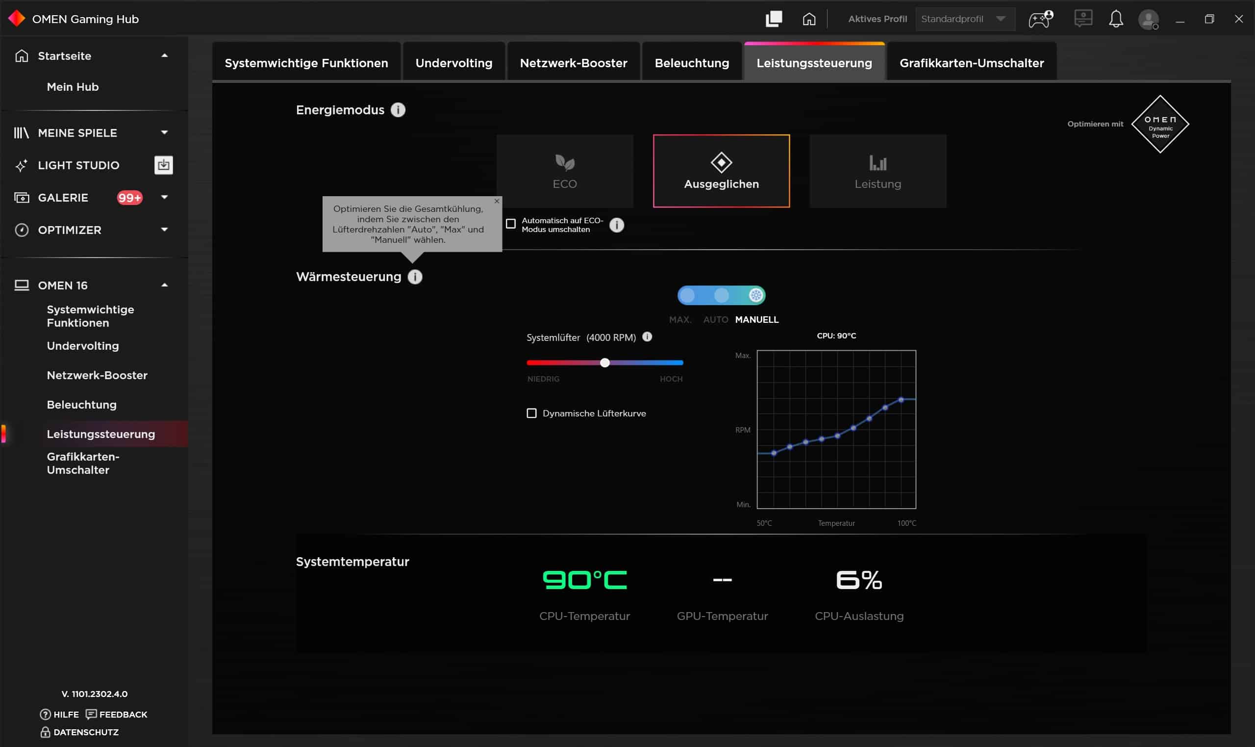 Allerdings gehen die Funktionen auch weit über die Basics hinaus. So lässt sich die CPU undervolten, während wir auf Wunsch auch eine eigene Lüfterkurve festlegen oder zwischen drei verschiedenen Leistungs-Modi des Notebooks wechseln – beispielsweise um Akku zu sparen oder das maximale Potenzial abzurufen. Auch lässt sich einstellen, ob der Omen 16 konstant auf die dedizierte GPU zurückgreifen oder intelligent und je nach Anwendung zwischen interner und dedizierter Grafiklösung wechseln soll.