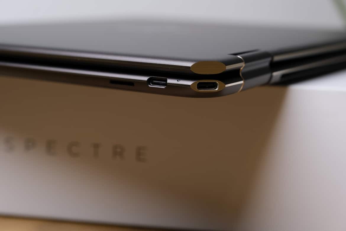 Die beiden USB-C-Ports unterstützen Thunderbolt 4 mit bis zu 40 Gbit/s, USB-Stromversorgung, DisplayPort-Alt-Modus (Version 1.4) und HP Sleep and Charge (was theoretisch das Laden angeschlossener Geräte wie Smartphones oder Ähnlichem auch im Ruhezustand des Notebooks erlaubt).