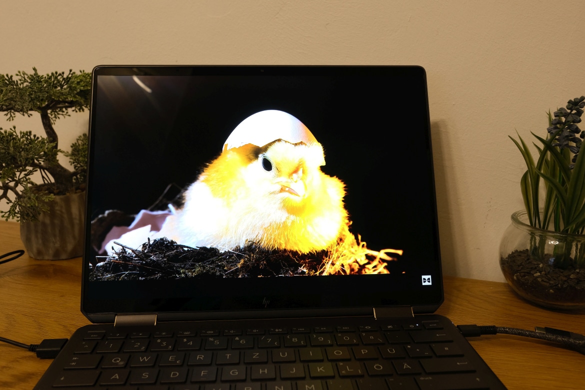 Das erstklassige OLED-Panel übernimmt das Spectre x360 ebenfalls aus dem Vorgänger. Es löst auf 13,5 Zoll mit 3.000 x 2.000 Pixeln im praktischen 3:2-Format auf, was bei der kompakten Größe für eine hervorragende Pixeldichte und entsprechend knackig scharfe Details und Texte sorgt.