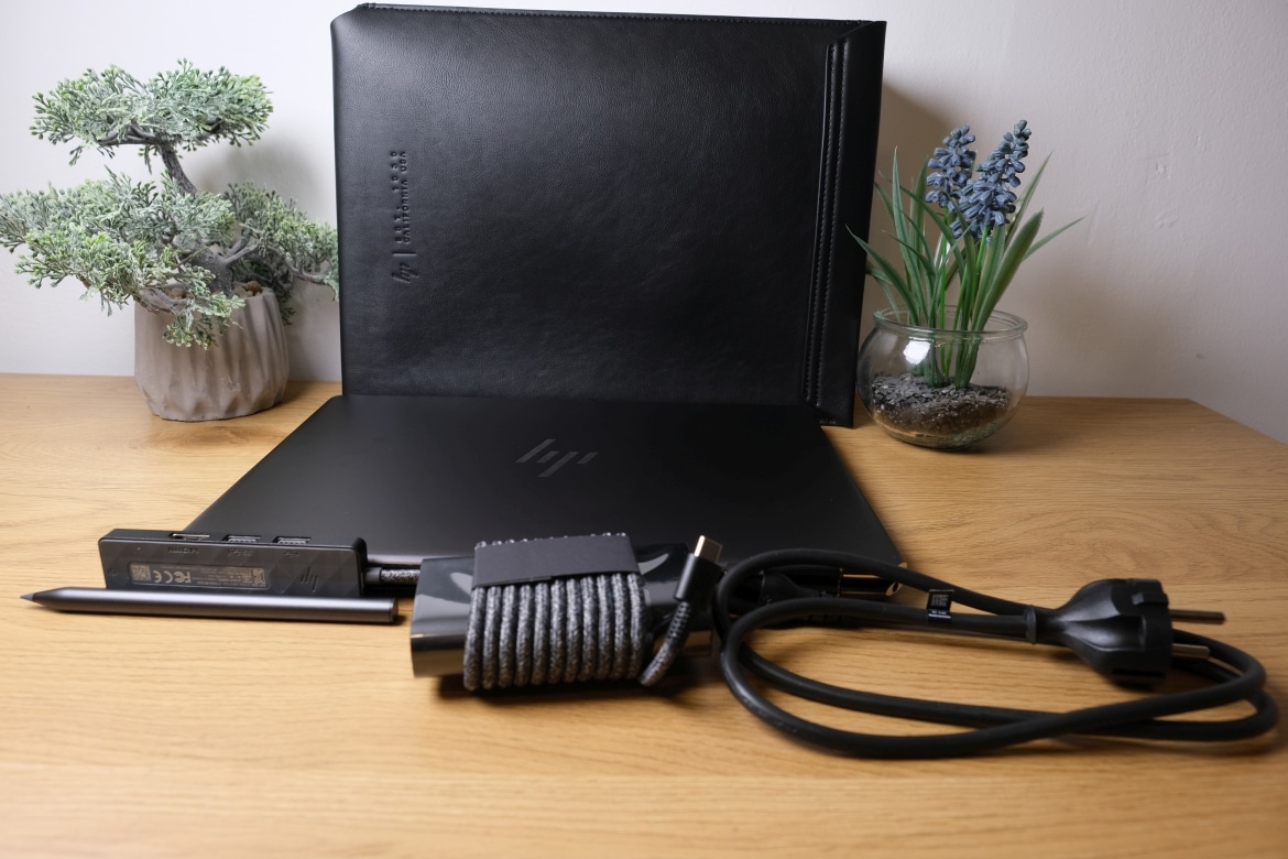 In der Verpackung findest du, neben dem Convertible-Notebook, ein 65-Watt-Netzteil samt stoffummanteltem USB-C-Kabel, denselben hochwertigen Stylus und eine Transporttasche. Neu in diesem Jahr ist allerdings auch ein USB-Hub, den Hersteller HP dem Spectre direkt beilegt.