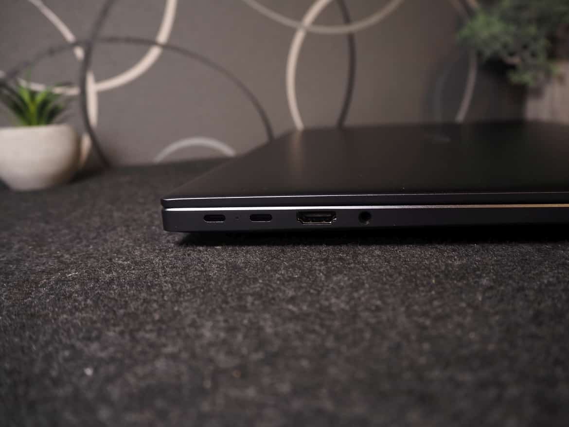 Die meisten Anschlüsse finden sich auf der linken Seite des Matebook 16s. Hier stehen die zwei Mal USB-Type-C (einmal mit Unterstützung für Daten, Laden und DisplayPort, einmal als Thunderbolt-4-Port), einmal HDMI und ein kombinierter 3,5-mm-Klinkenanschluss zur Verfügung.