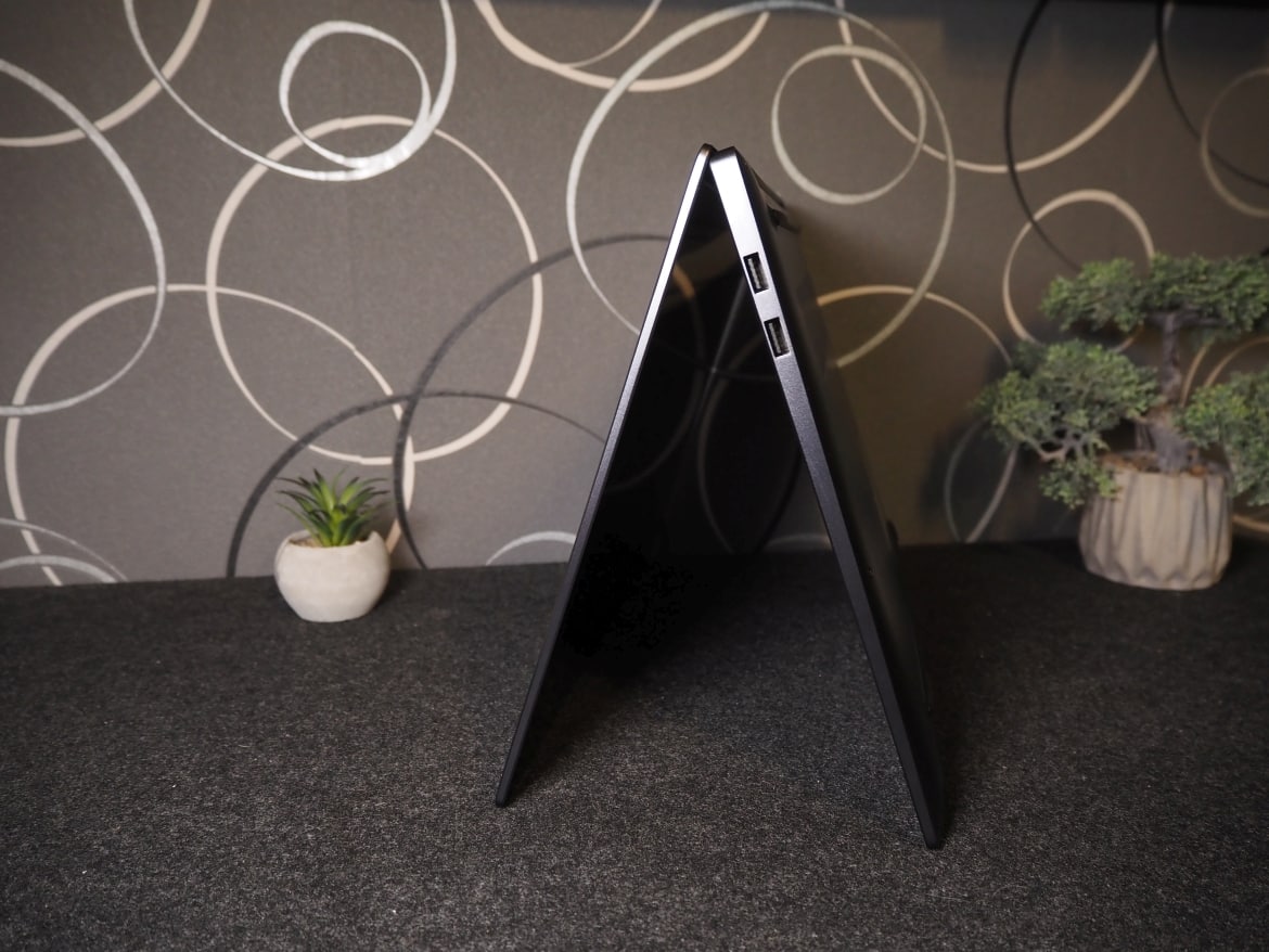 Es ist 351 mm breit, 254 mm tief und im geschlossenen Zustand mit rund 14 mm hinten, sowie 8 mm vorne recht kompakt gehalten. Zumindest wenn du bedenkst, dass im Inneren ein 16-Zoll-Display seinen Dienst verrichtet. Auch das Gewicht von 1.990 Gramm geht für die Größe absolut in Ordnung.