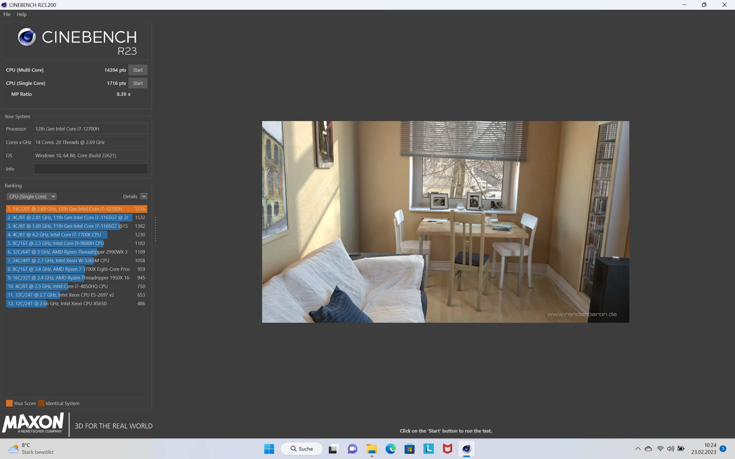 Den reinen CPU-Test Cinebench R23 können wir schnell abhaken, denn hier agiert der Core i7-12700H genau so, wie wir es erwarten würden. Mit 14.394 Pkt. im Multi-Core- und 1.716 Pkt. im Single-Core-Test liegt man hier auf Augenhöhe mit den bereits angesprochenen Notebooks, die auf denselben Prozessor setzen.