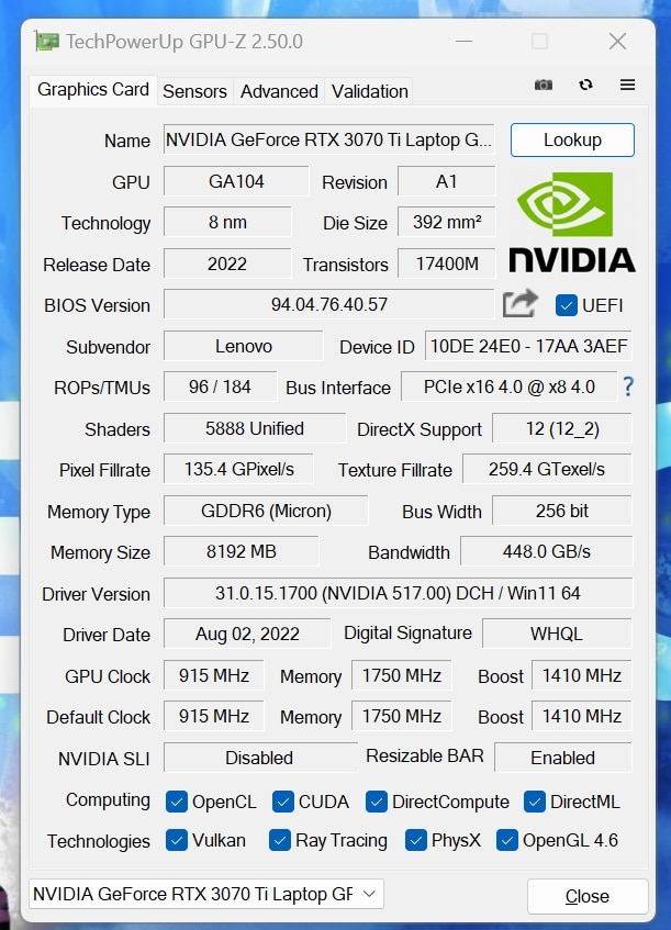 | Grafikleistung | Nvidia GeForce RTX 3070 Ti (8 GB GDDR6 VRAM); 125 W TDP |