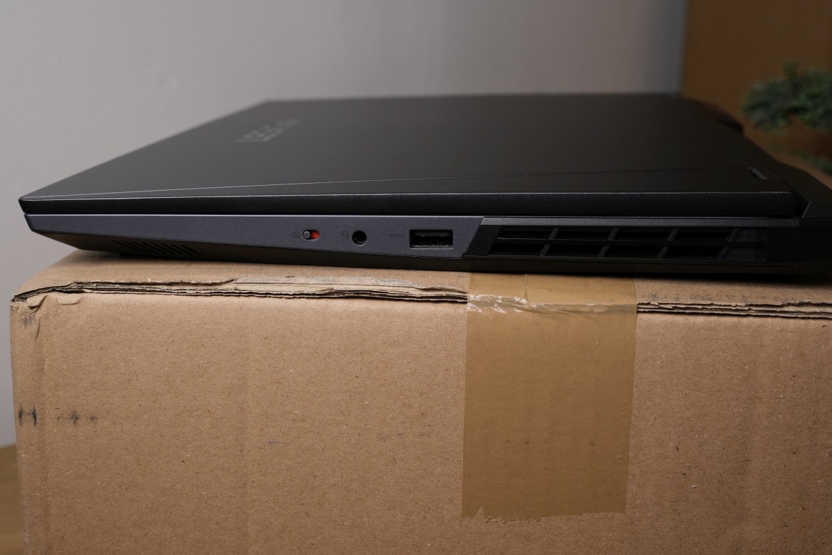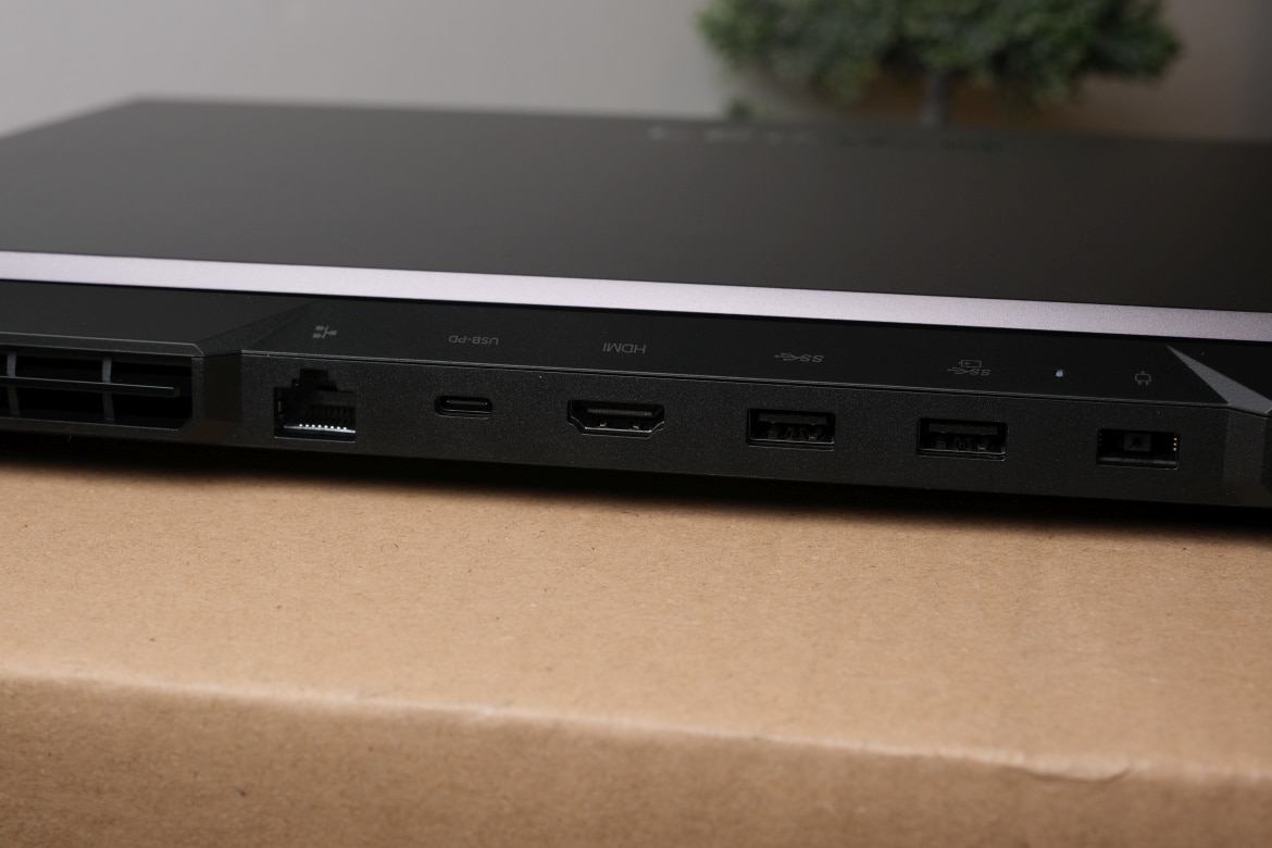 Zwischen zwei großen Luftauslässen sitzen hier RJ45-Gigabit-LAN, USB 3.2 Gen 2 Type-C (mit PowerDelivery und DP 1.4), HDMI 2.1, USB-A 3.2 Gen 1 und der Stromanschluss. Für Peripherie und weiteres Zubehör findest du die Anschlüsse auf beiden Seiten des Laptops.