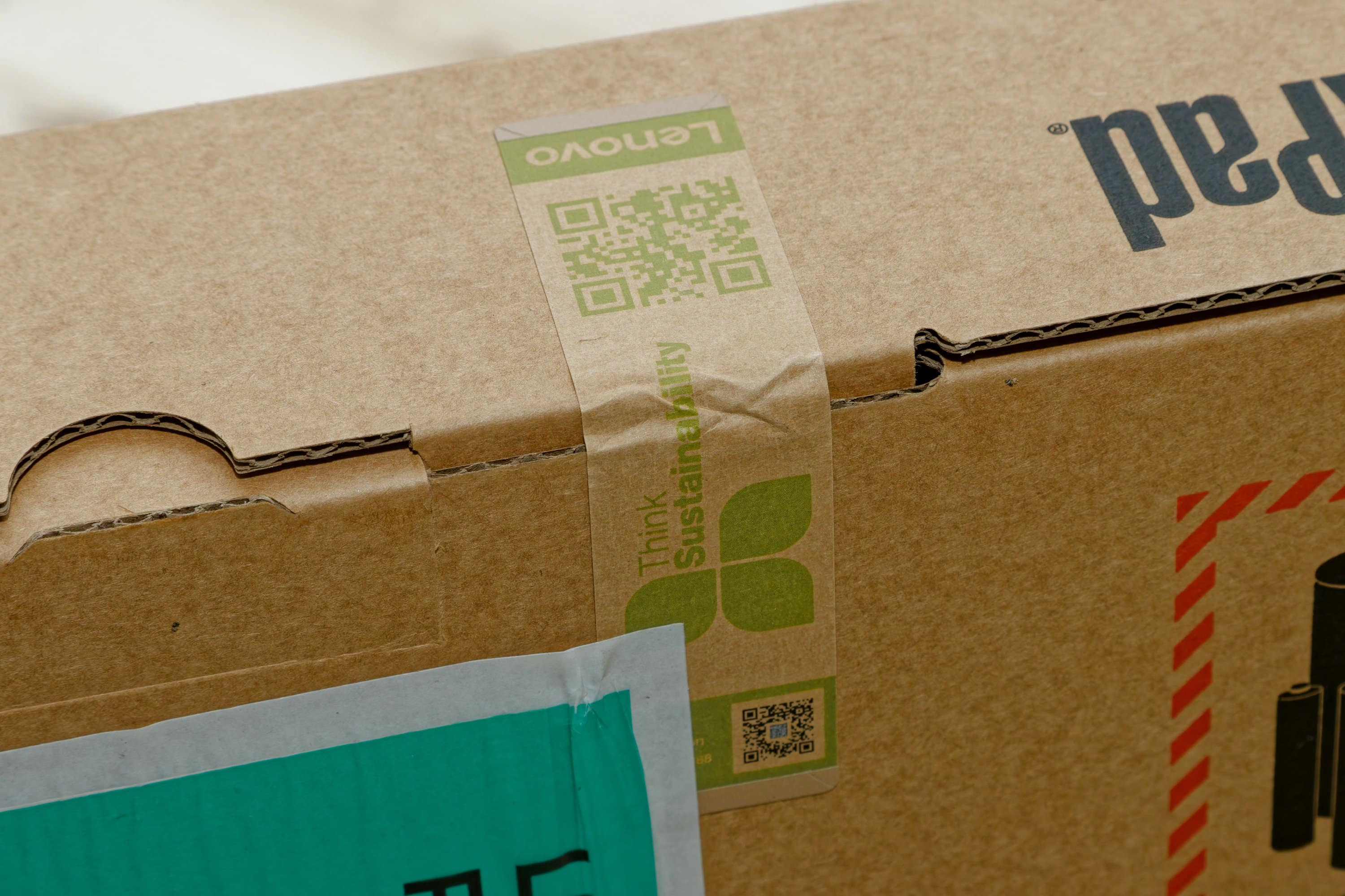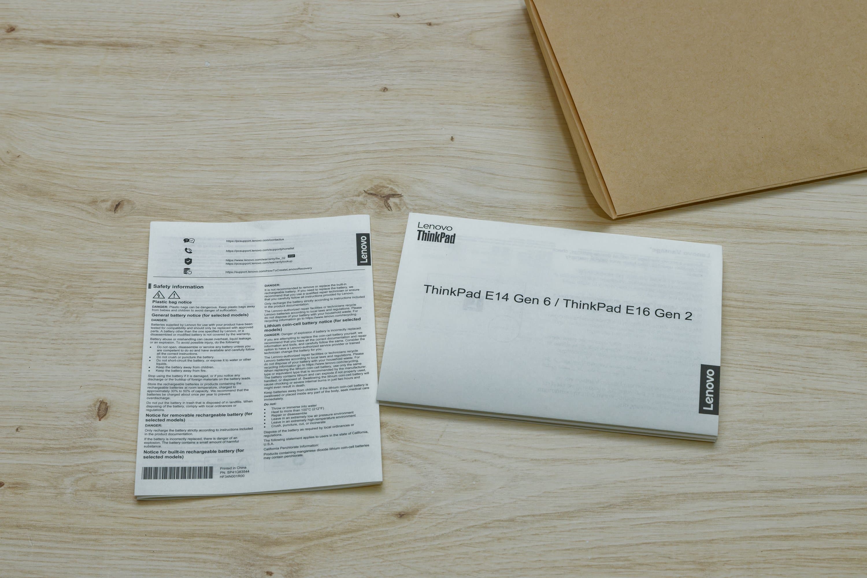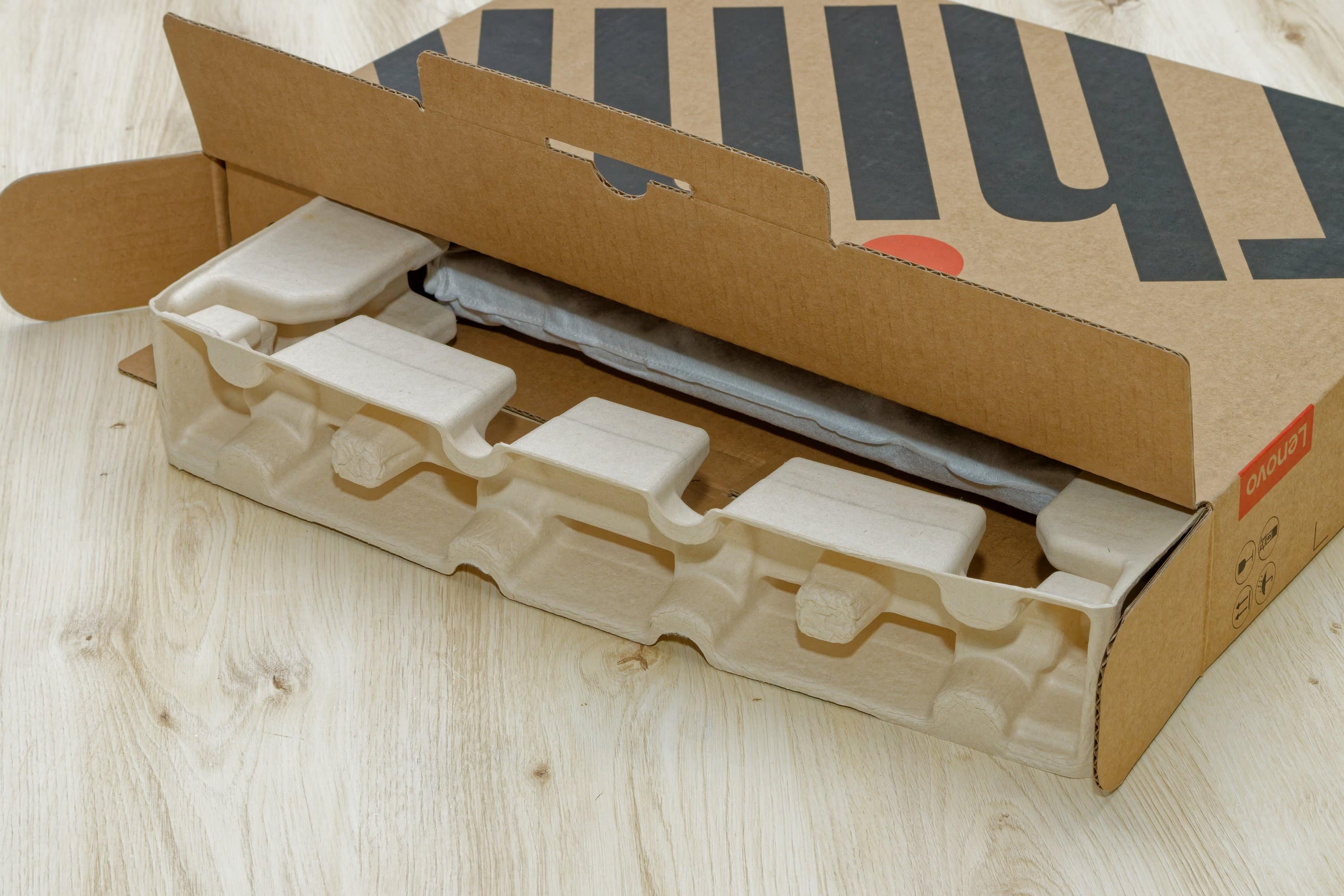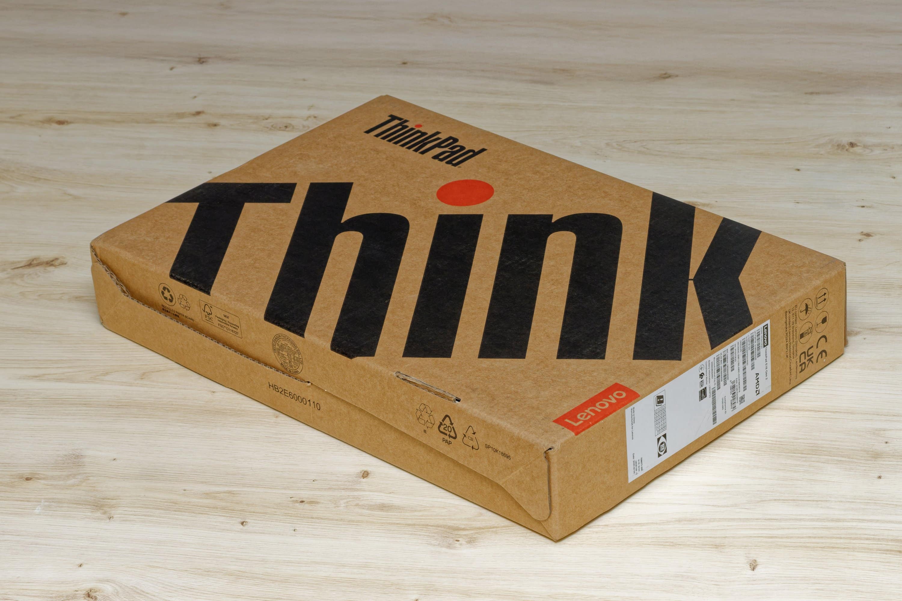 Das Lenovo Thinkpad E16 G2 kommt in einem braunen Karton, der großflächig mit dem Think-Logo bedruckt ist. Wo schon das Siegel auf die Nachhaltigkeit hinweist, wird das Konzept im Inneren fortgesetzt. Man findet keine Plastiktüten, sondern der Laptop wird gehalten von einem Konstrukt, das an eine Eierschachtel erinnert. Es besteht auch aus einem ähnlichen Papiermaterial, ist aber noch weicher als ein Eierkarton. Daneben steckt noch eine Pappschachtel mit dem Netzteil.
