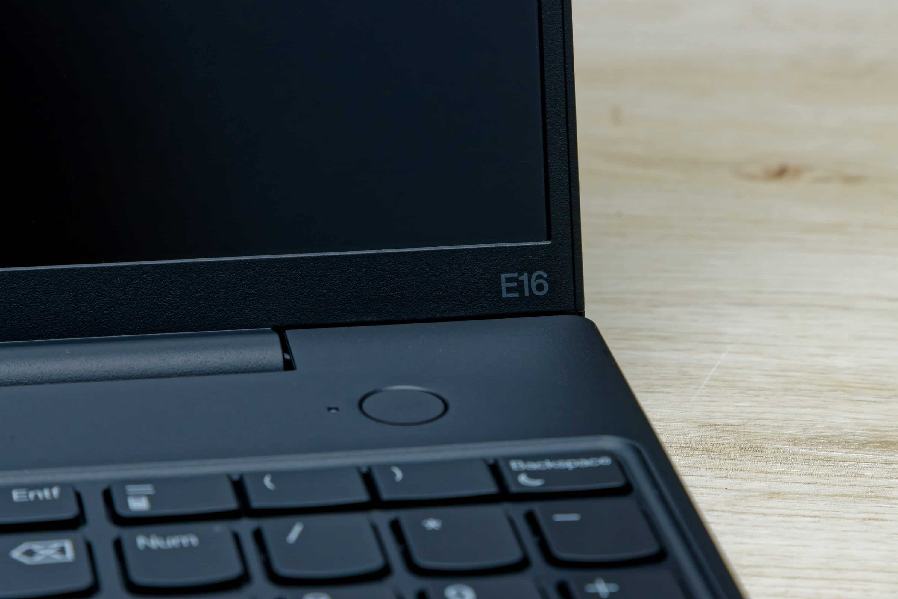 Das klassische mattschwarze Gehäuse des Lenovo Thinkpad E16 G2 aus diesem Test trägt das altbekannte Thinkpad-Logo, dessen i-Punkt seit ein paar Generationen im eingeschalteten Zustand leuchtet. Davon abgesehen blickt man am unteren Ende auf das inzwischen betonte Lenovo-Logo.
