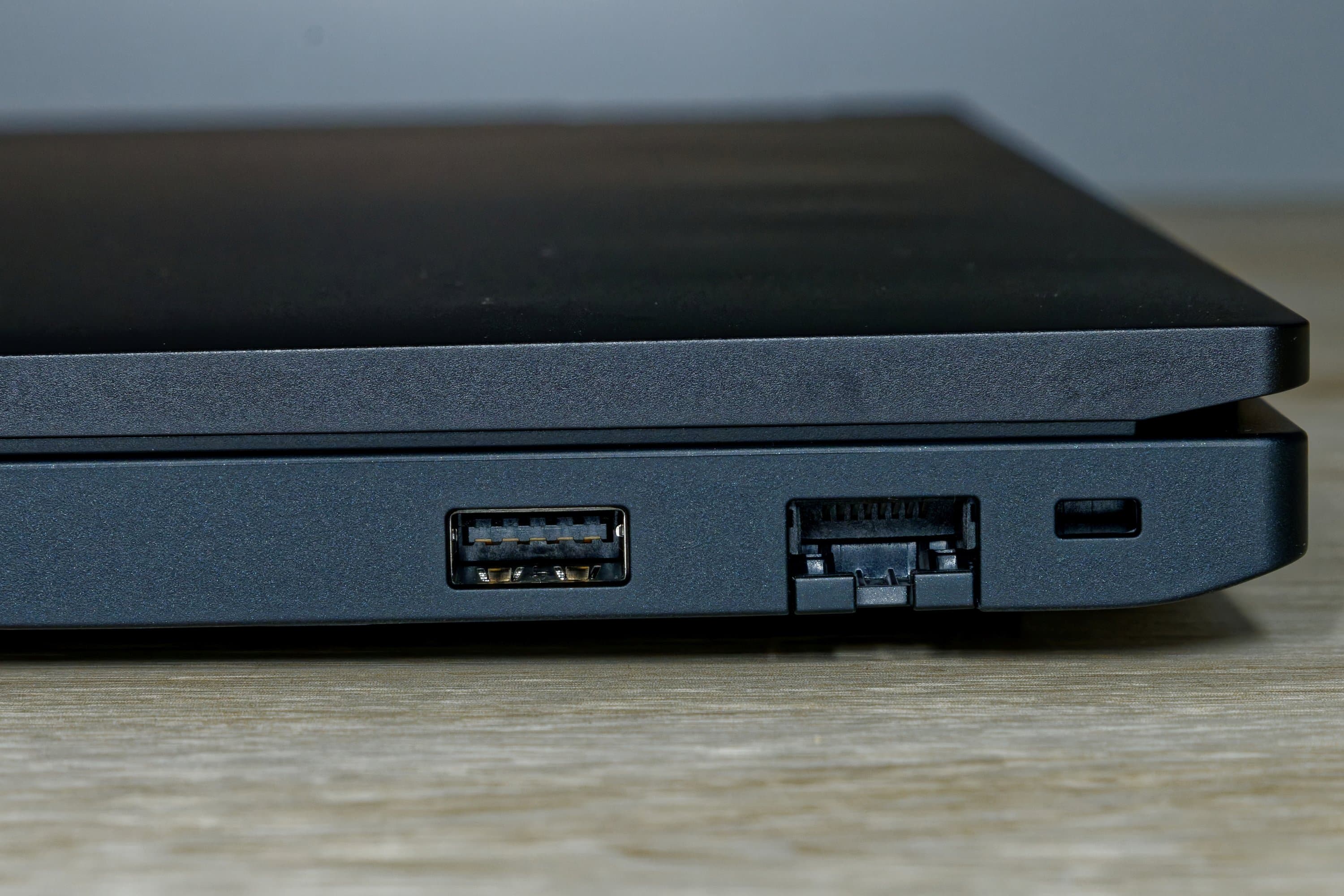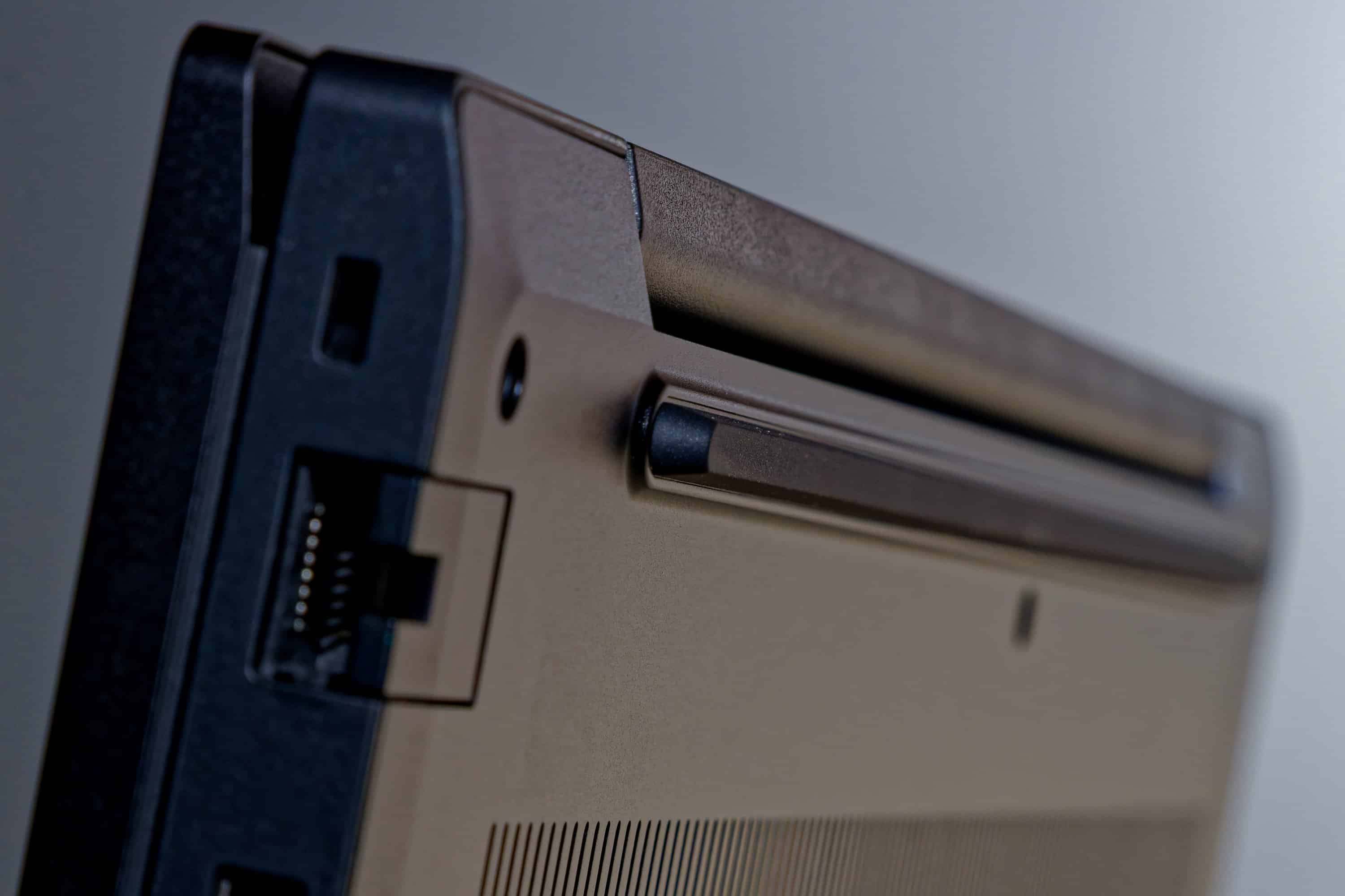 Rechts befindet sich neben dem bereits genannten USB-A-Anschluss noch ein RJ-45-Netzwerkkabel-Anschluss und für den Fall, dass der Laptop physisch gesichert werden soll, gibt es den obligatorischen Kensington-Lock.