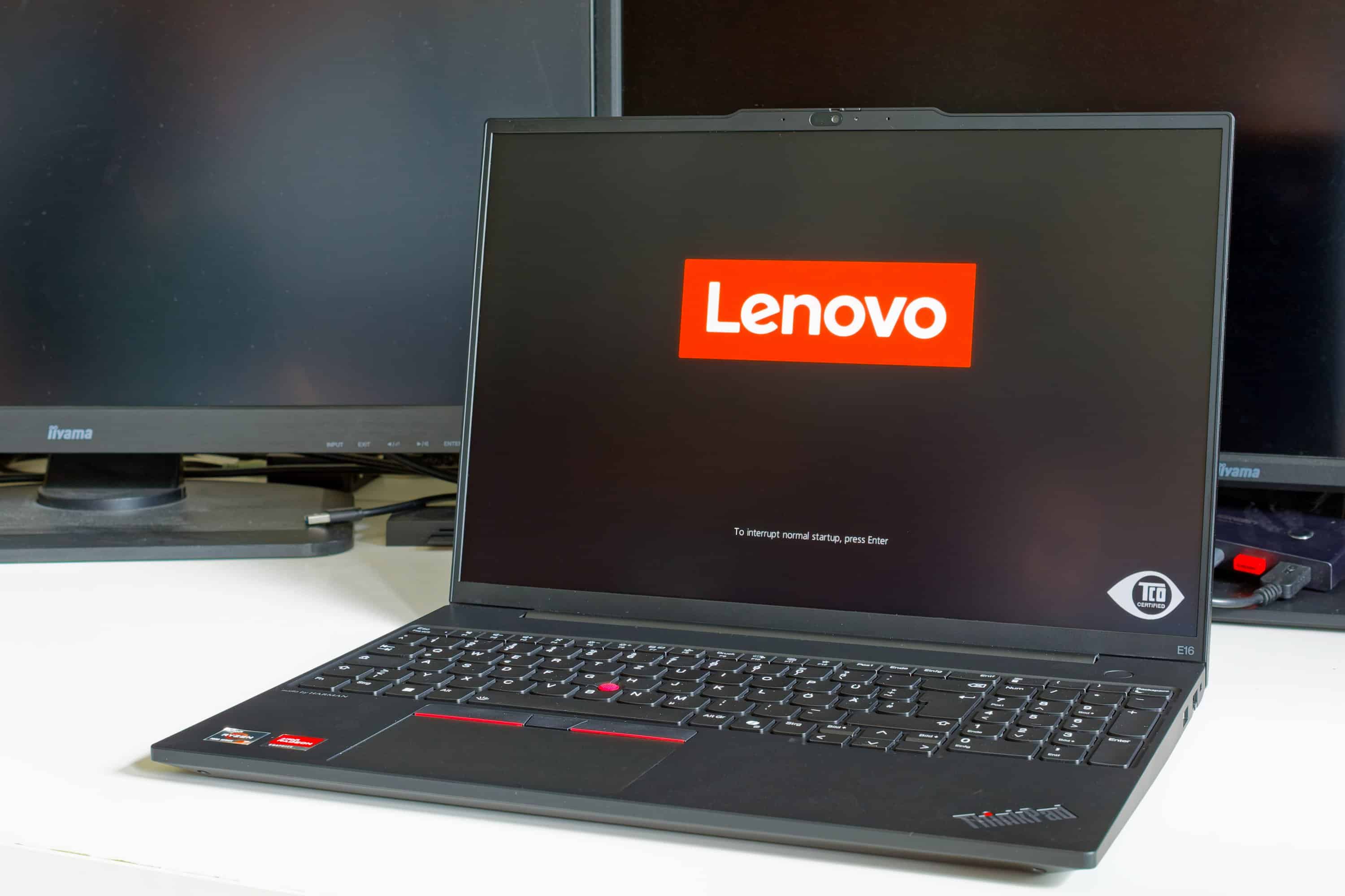 Beim ersten Start muss man – wie bei AMD-Desktop-Rechnern – eine Weile warten, bis auf dem Bildschirm des Lenovo Thinkpad E16 G2 etwas passiert. Kein Drama, nur eine kurze Irritation, wenn man vom Intel-Rechner kommt. Anschließend beginnt die übliche Einrichtung, aber das ist ein typischer Windows-Prozess. Der Testrechner kommt ab Werk mit Windows 11 und zieht auch ein paar Updates, nachdem das WLAN eingerichtet wurde.