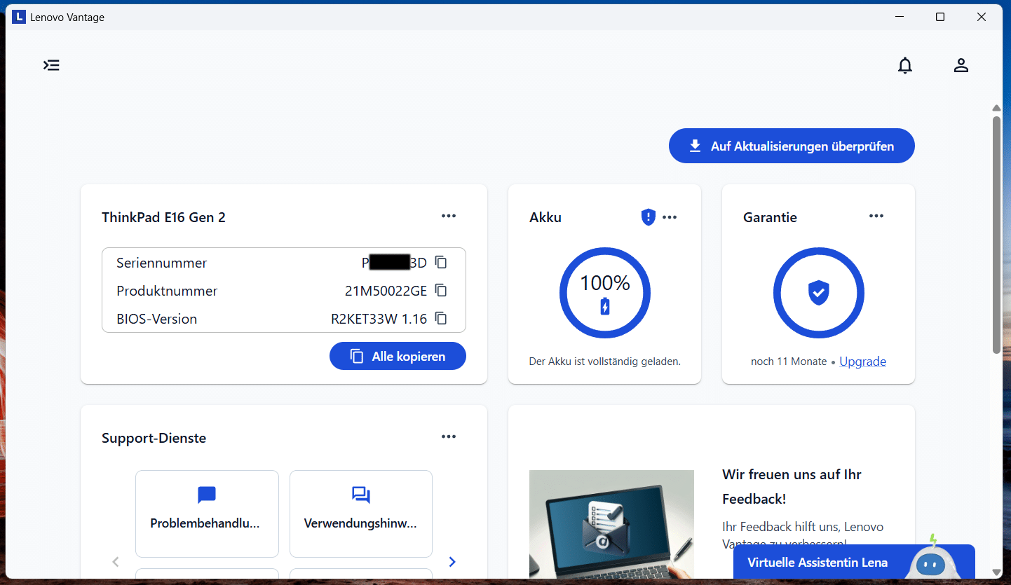 „Lenovo Vantage“ dagegen ist durchaus sinnvoll, denn damit kann man einerseits gerätespezifische Daten einsehen: Seriennummer, Spezifikationen, verbleibende Garantie. Darüber hinaus können Updates durchgeführt werden von Treibern bis hin zum BIOS – und ganz ehrlich: Da ist das BIOS-Update wirklich simpel. Einfach nur über das Programm das Update starten und dann erledigt das Gerät alles selbst und startet ein paarmal neu. Lediglich meine Anmeldung via Windows Hello hat es anscheinend zerschossen – diese lief nach dem Update nicht mehr und musste frisch eingerichtet werden.