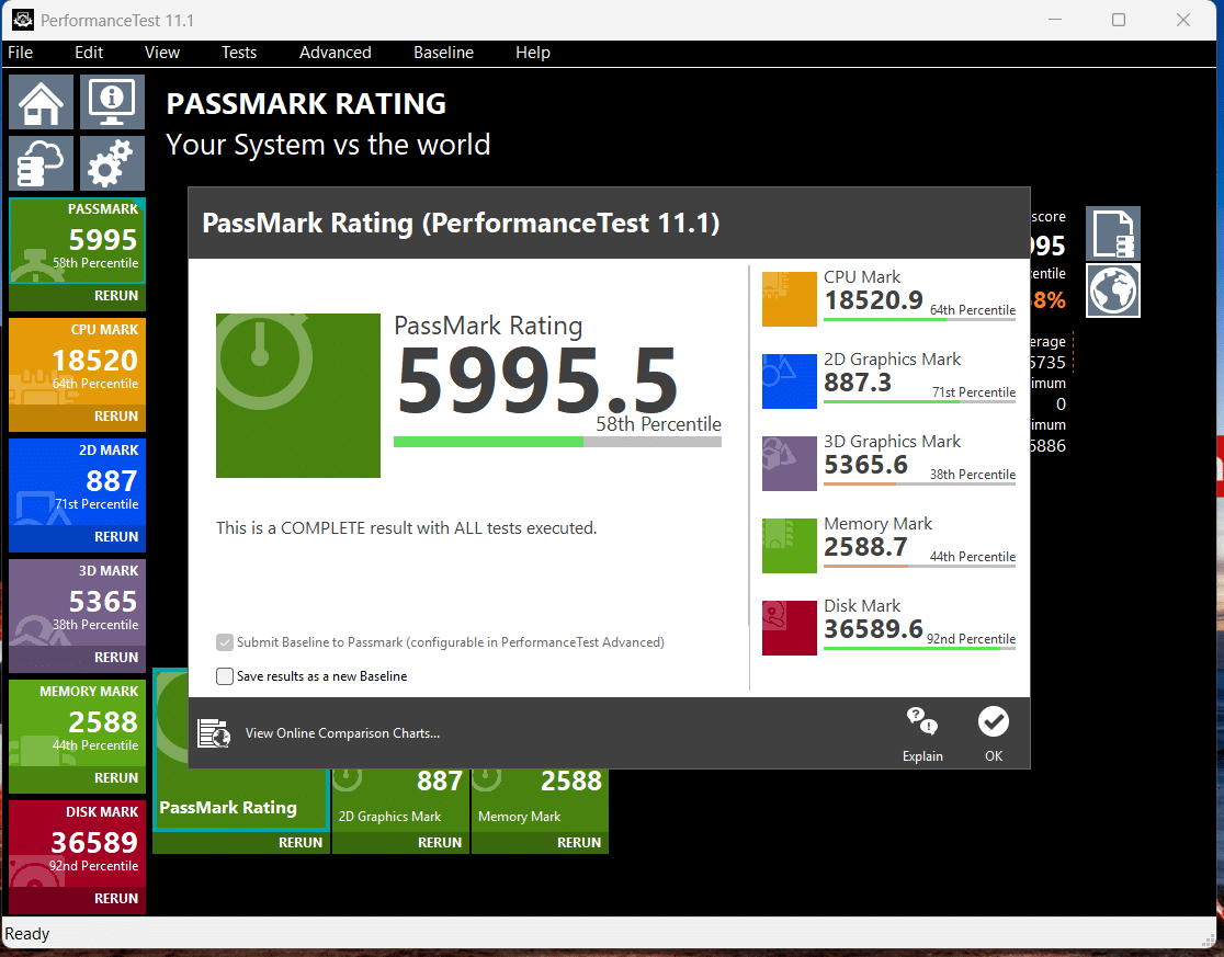 Als Test habe ich Passmark gewählt, das alle Bereiche testet und gegeneinander vergleicht. Diesen Test habe ich einmal mit einer festen Stromverbindung durchgeführt und einmal im Akku-Betrieb. Wie üblich ist bei letzterem ein starker Leistungsverfall festzustellen. Die reduzierte Leistung sorgt jedoch für einen deutlich geringeren Stromverbrauch und sorgt dafür, dass die Akkulaufzeit damit nicht dramatisch abfällt.