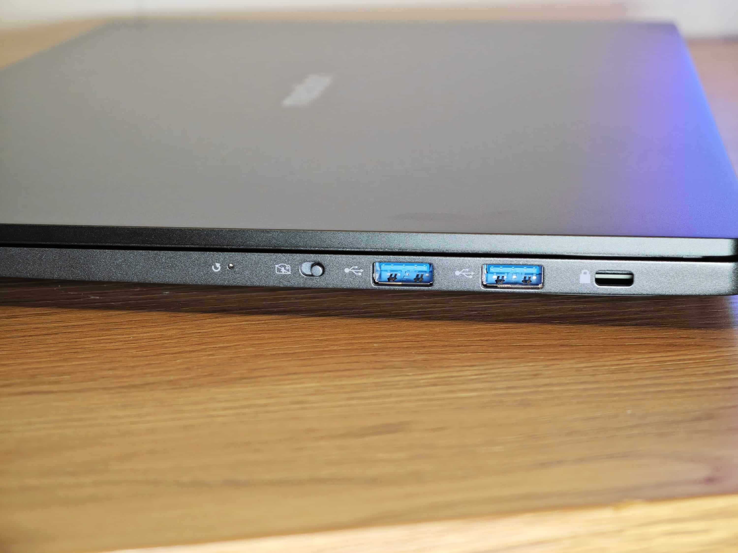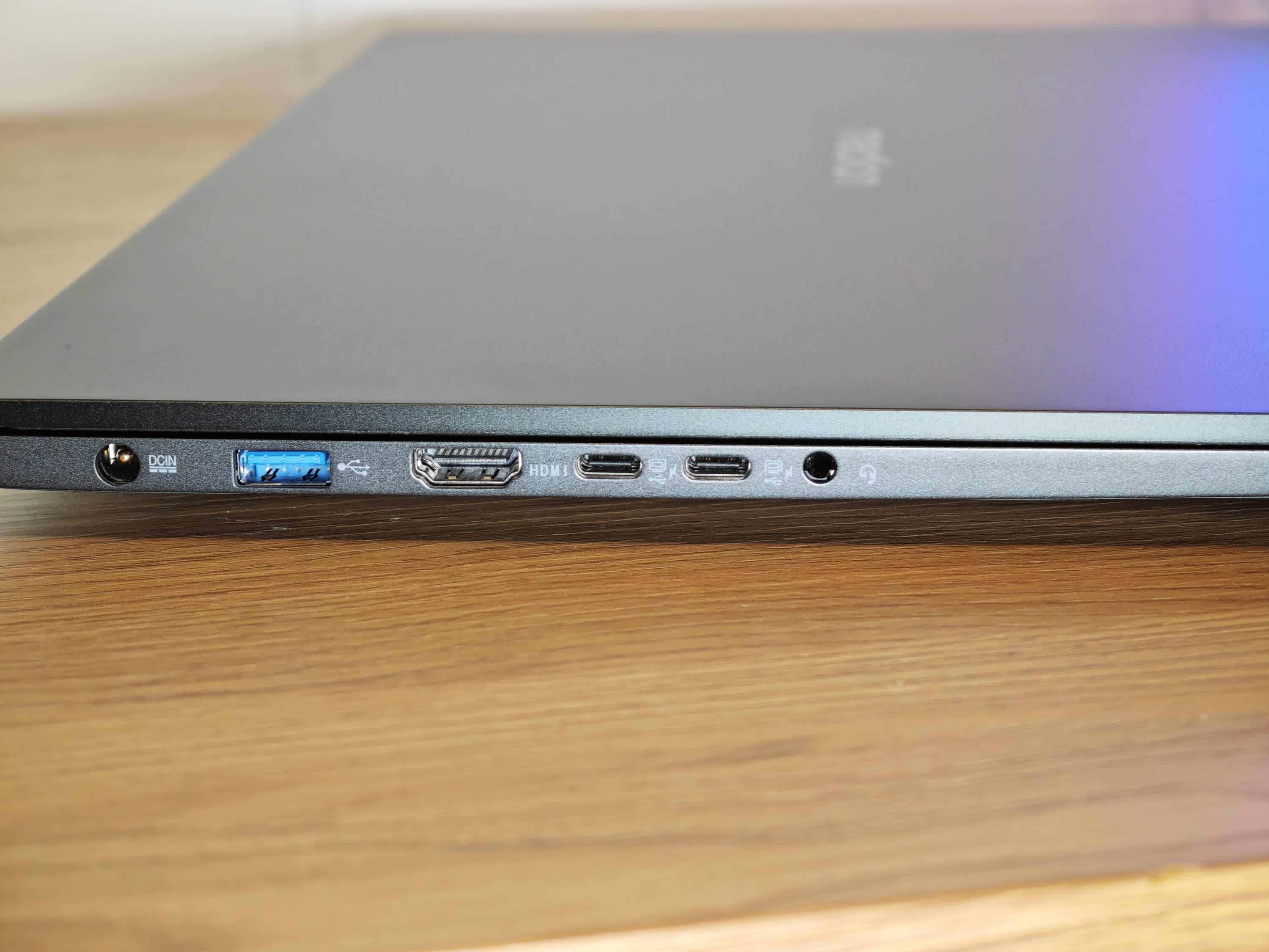 Bei den Anschlüssen hat Medion leider ein wenig gespart, auch wenn die Auswahl durchaus gut aufgestellt ist. Auf der linken Seite gibt es einmal HDMI, einmal USB 3.2 Gen 1 Type-A, zweimal USB 3.2 Gen 1 Type-C (inklusive DP-Alt-Modus) und einen kombinierten 3,5-mm-Klinkenanschluss.