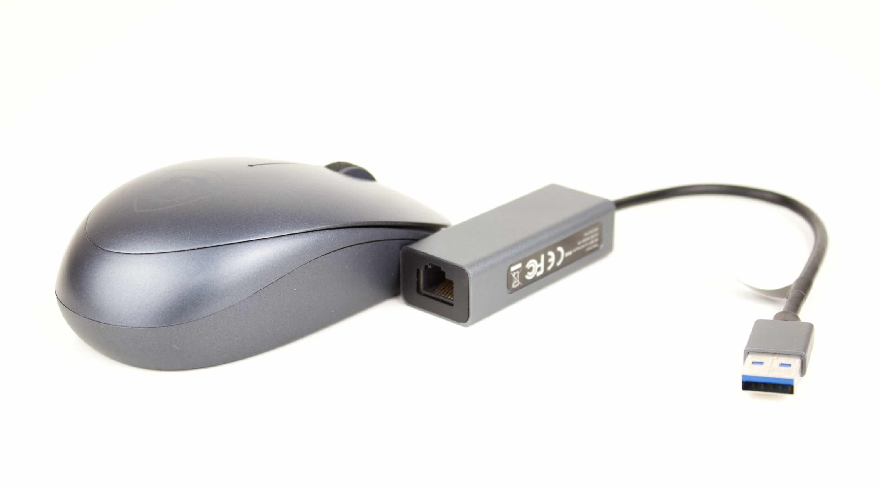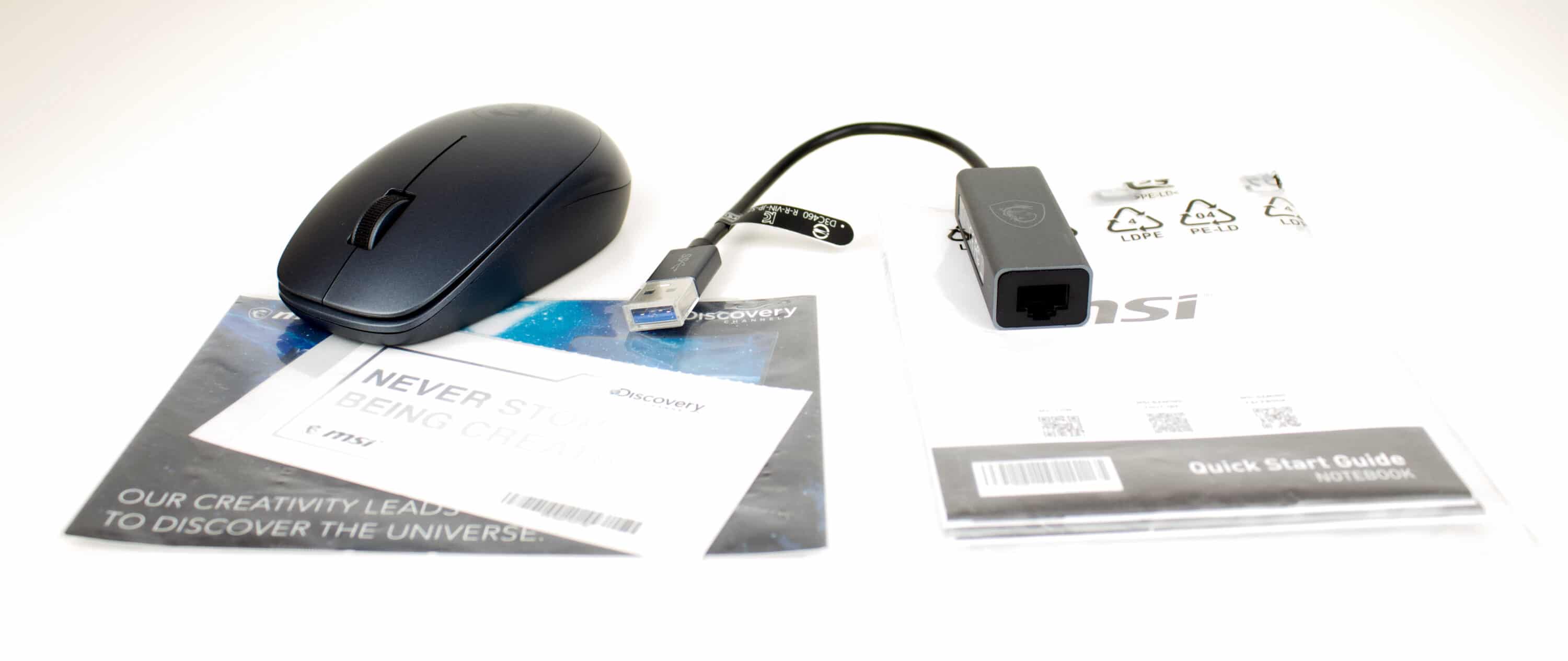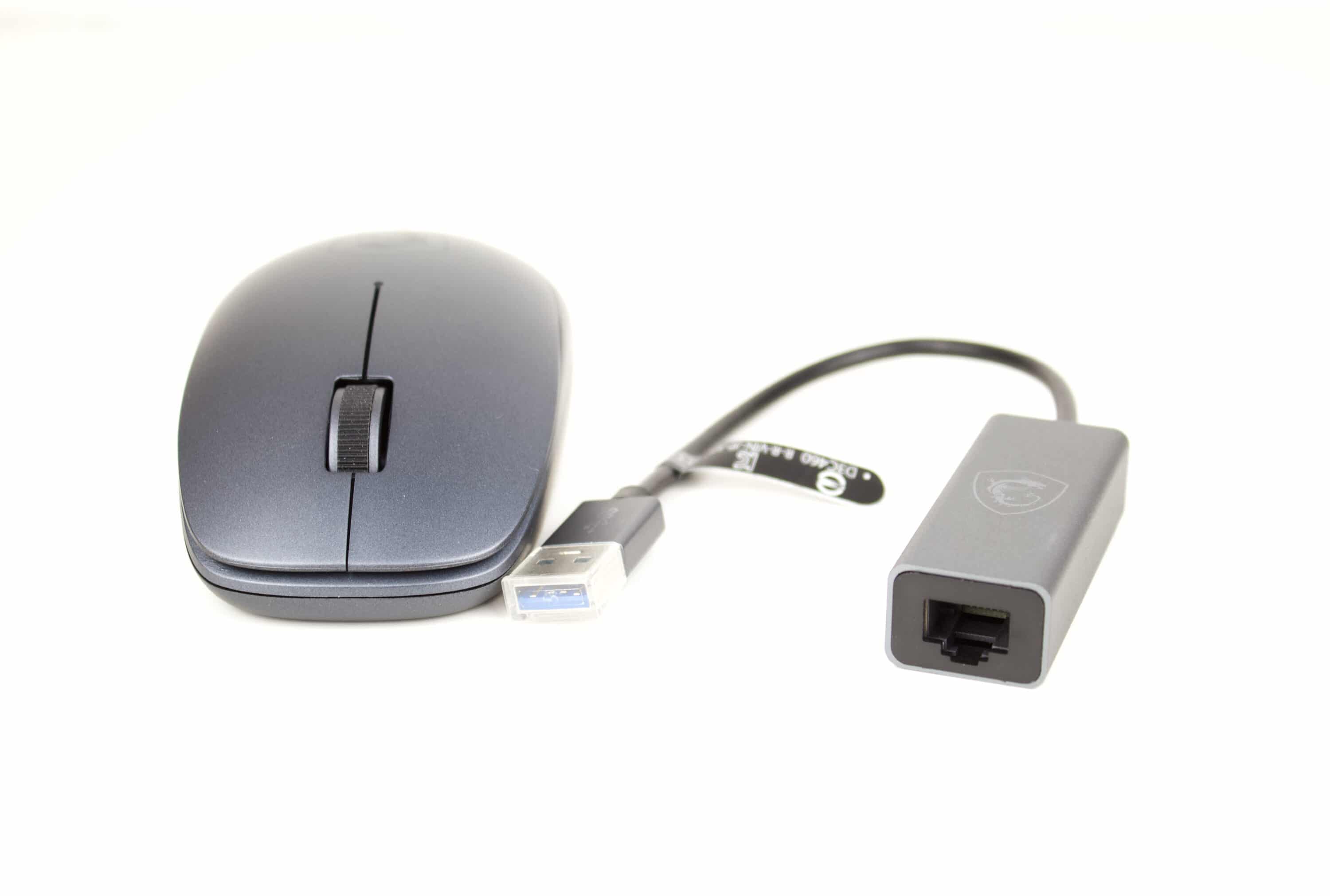 Zum anderen befindet sich – neben den typischen Begleitheften – eine einfache Tasche, eine kabellose Maus und ein RJ45-Adapter im Lieferumfang.