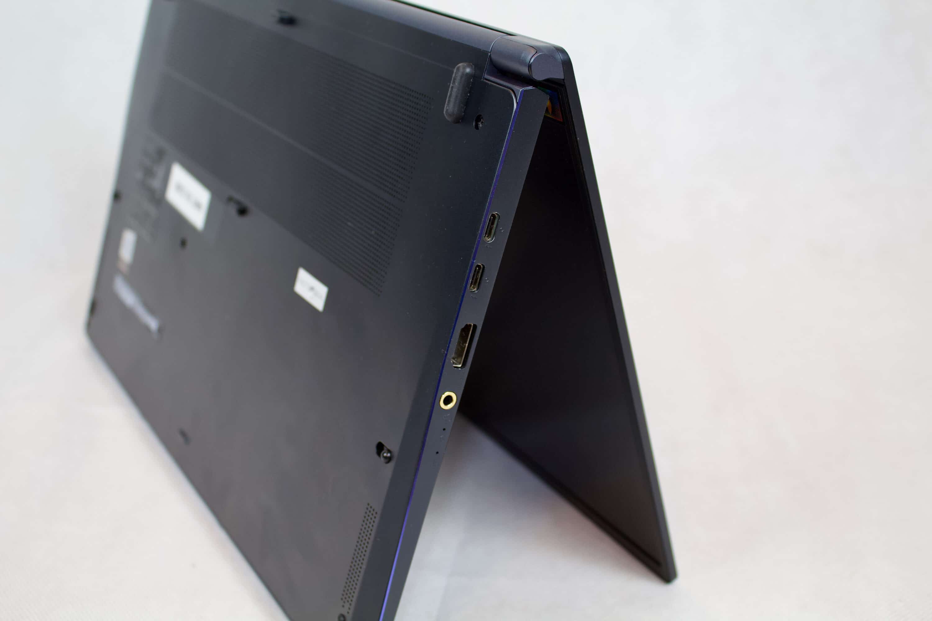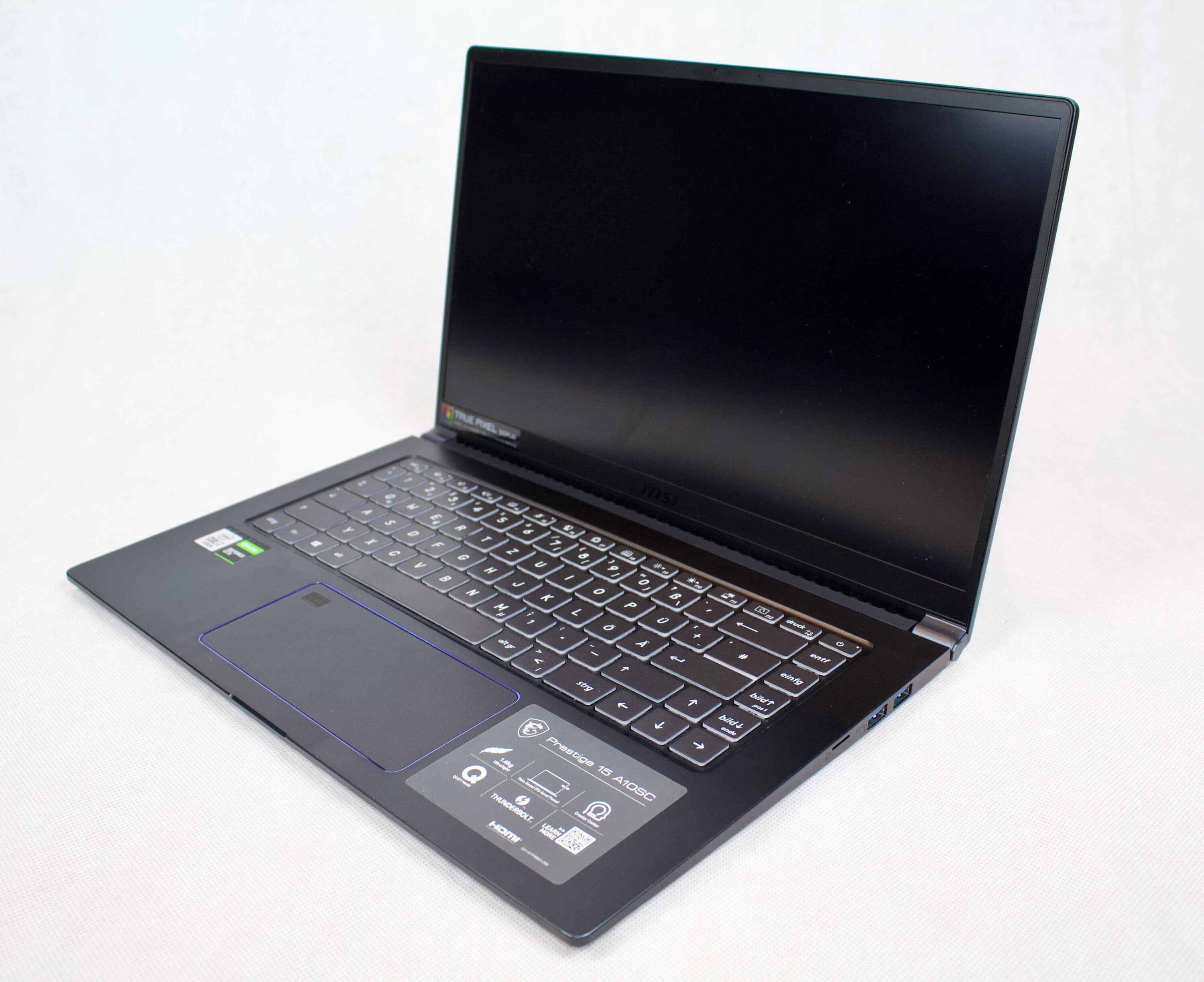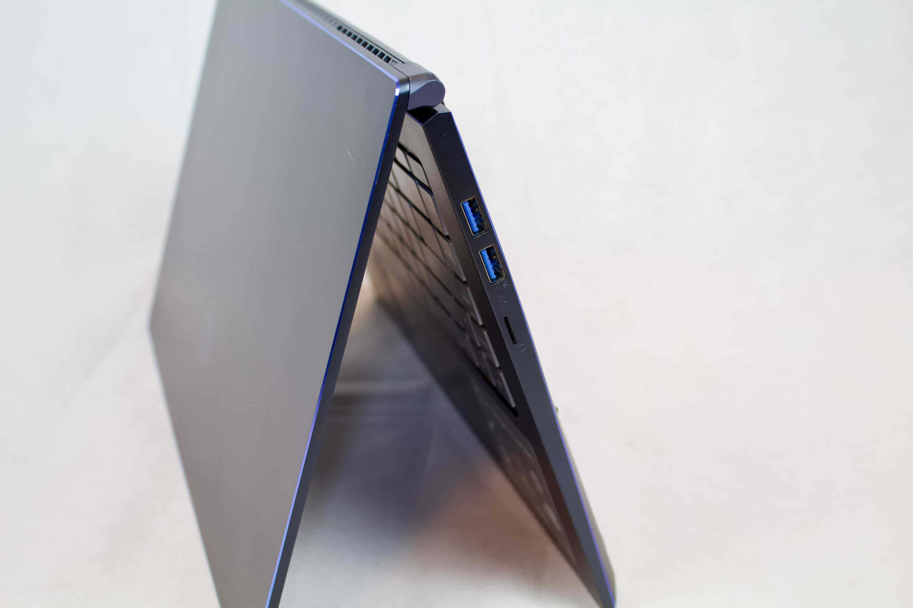 Das Scharnier des Prestige 15 ermöglicht einen sehr hohen Winkel von 180 Grad. Auch hier setzt sich der Eindruck von außen fort: die Verarbeitungsqualität und Verwindungssteifigkeit ist gut.