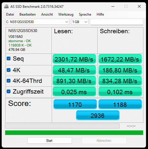 Wie bereits erwähnt, stammt die verbaute NVMe-SSD aus dem Hause Netac und verfügt über den PCIe 3*4-Standard. Leider sind die im Benchmark erreichten Geschwindigkeiten eher ernüchternd und reizen nicht mal den PCIe-3.0-Standard voll aus. Rund 2300 MB/s beim Lesen und 1700 MB/s beim Schreiben sollten für die typischen Alltagsaufgaben aber mehr als ausreichend sein.