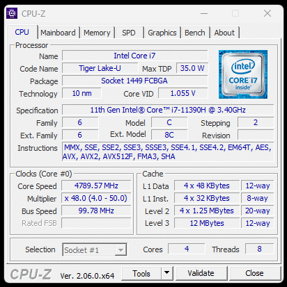 Unser Testmuster kommt ab Werk mit einer soliden Ausstattung. Das Herz des Systems ist ein Intel Core i7-11390H, der mit 4 Kernen bzw. 8 Threads überzeugen soll. Abhängig von Auslastung und Temperatur sollen zwei CPU-Kerne gleichzeitig bis zur magischen 5GHz-Marke takten. Als Mindesttakt gibt Intel für den i7-11390H eine Taktrate von 4x 3,4GHz an.