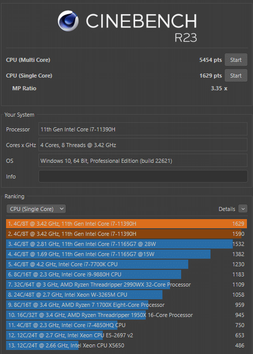 Vergleicht man die erreichten Werte mit denen anderer Tests zum Intel Core i7-11390H, dann fällt direkt auf, dass zumindest die Multi-Core Ergebnisse in Cinebench R23 um circa 10 bis 15 Prozent ausfallen. Die Vergleichswerte stammen jedoch von Varianten, bei denen die CPU zwischen 45W bis 64W verbrauchen darf. Der i7-11390H ist im CK10 jedoch auf 35W beschränkt. Deshalb gehen die erreichten Werte so in Ordnung. Verbaut man einen zweiten RAM-Riegel (Dual Channel), lässt das Cinebench R23 absolut kalt. Die maximalen Scores ändern sich dadurch nicht.