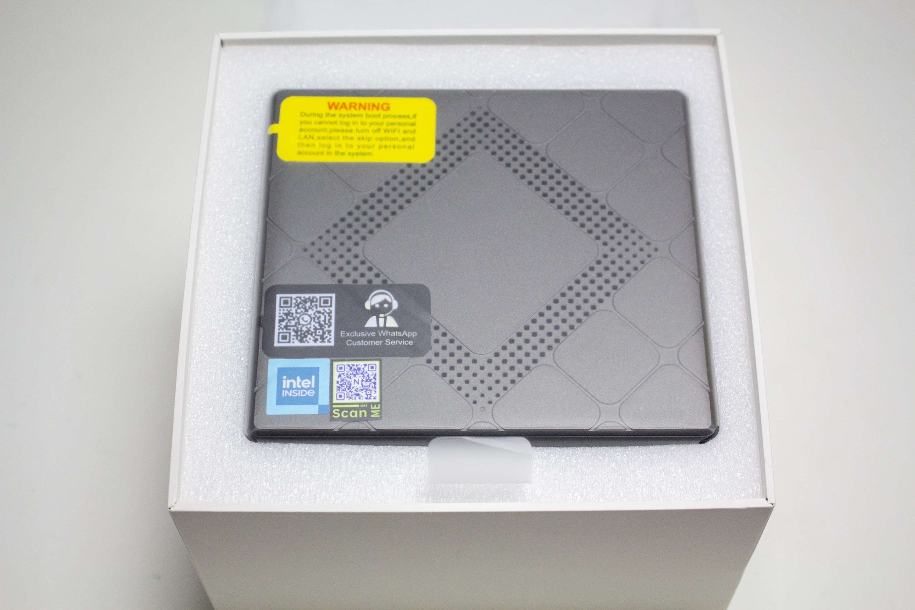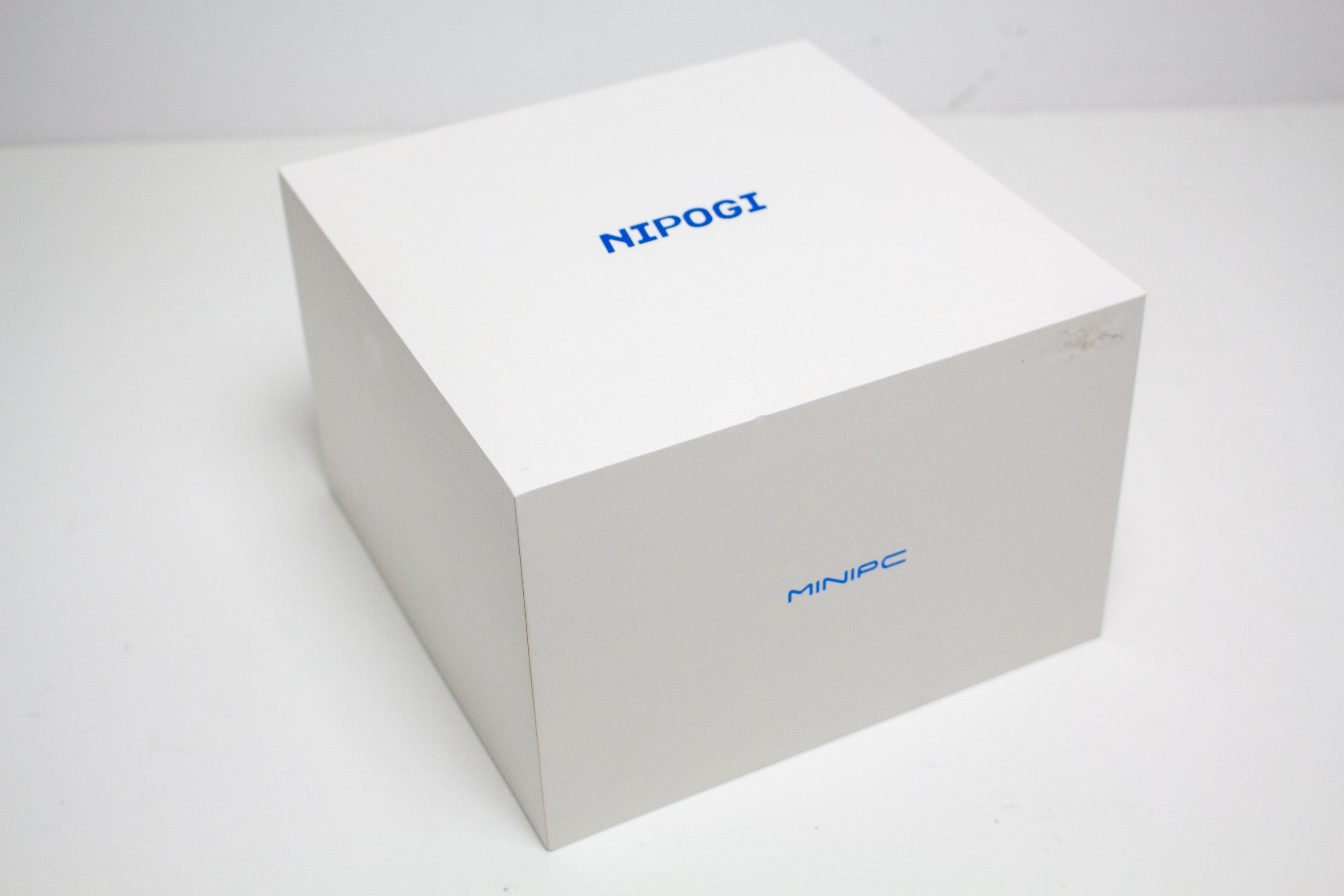 Geliefert wird der NiPoGi CK10 Mini-PC in einem unauffälligen, braunen Karton. Dieser beinhaltet neben zwei Formen aus Schaumstoff auch einen weiteren Karton. Dieser ist wiederum weiß gefärbt und wurde mit einem farbigen Herstellerlogo sowie dem Schriftzug „Mini PC“ bedruckt. Außerdem finden wir auf der Rückseite eine Auflistung der technischen Daten.