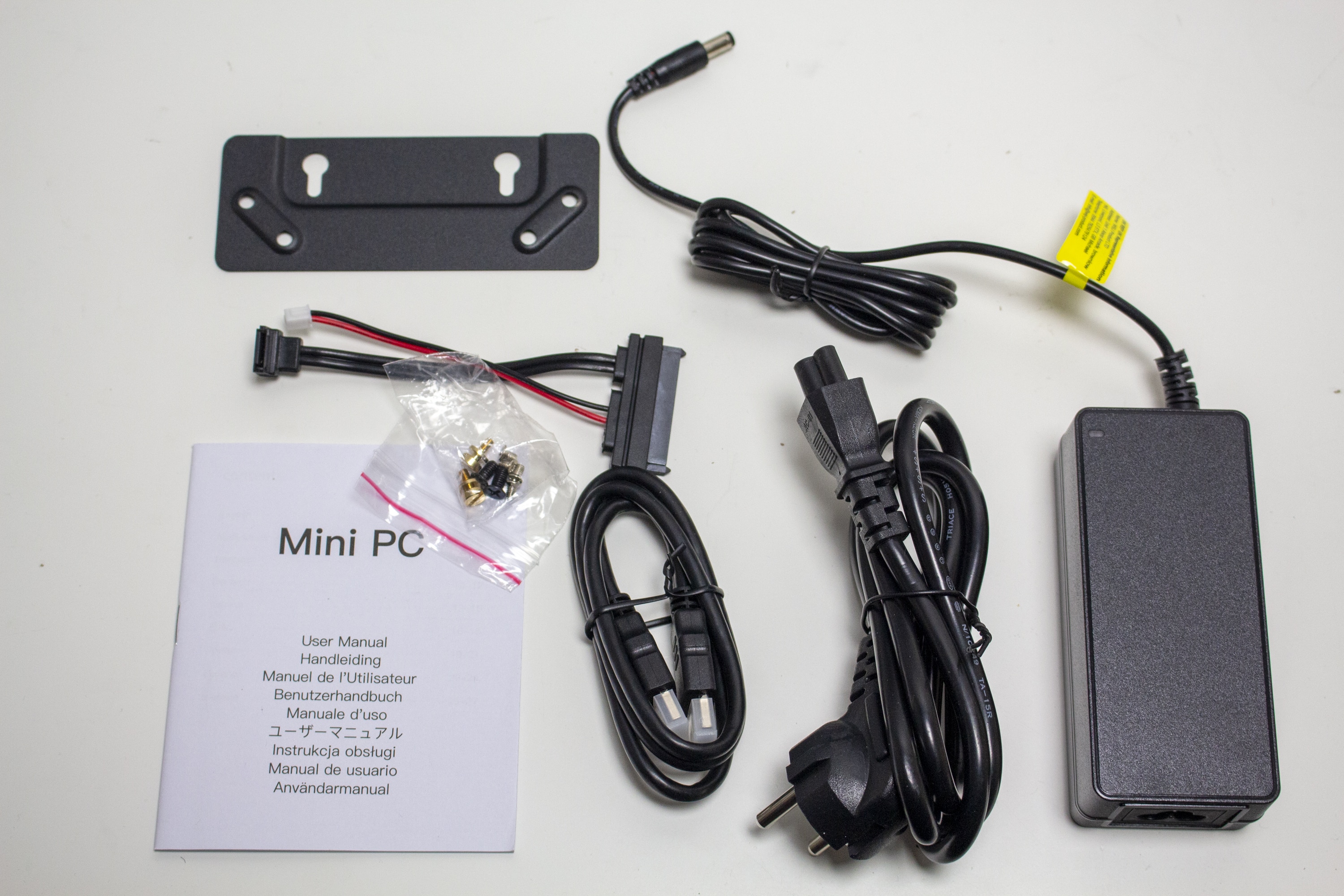 Innerhalb der hochwertigen Umverpackung begegnet man zunächst direkt dem Mini-PC, der von einer Form aus Schaumstoff und einer Kunststofffolie umhüllt wurde. Darunter findet man, in einer weiteren Schachtel, das mitgelieferte Zubehör. Vorhanden sind ein 65W-Netzteil, eine VESA-Halterung inklusive Schrauben, eine Bedienungsanleitung, ein Adapterkabel für einen 2,5″-SATA-Datenträger sowie passende Montageschrauben und ein kurzes HDMI-Kabel.