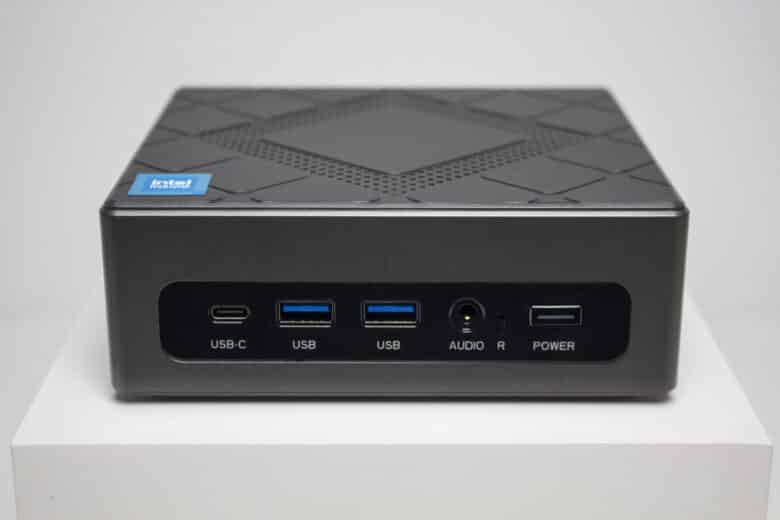 Der NiPiGo CK10 wurde mit einer Vielzahl an Anschlüssen ausgestattet. Das I/O-Panel in der Front verfügt über zwei USB-A- und einen USB-C-Port. Daneben lassen sich ein 3,5mm-HD-Audio-Anschluss für Kopfhörer bzw. Mikrofon sowie zwei Taster für Power und Reset erkennen.