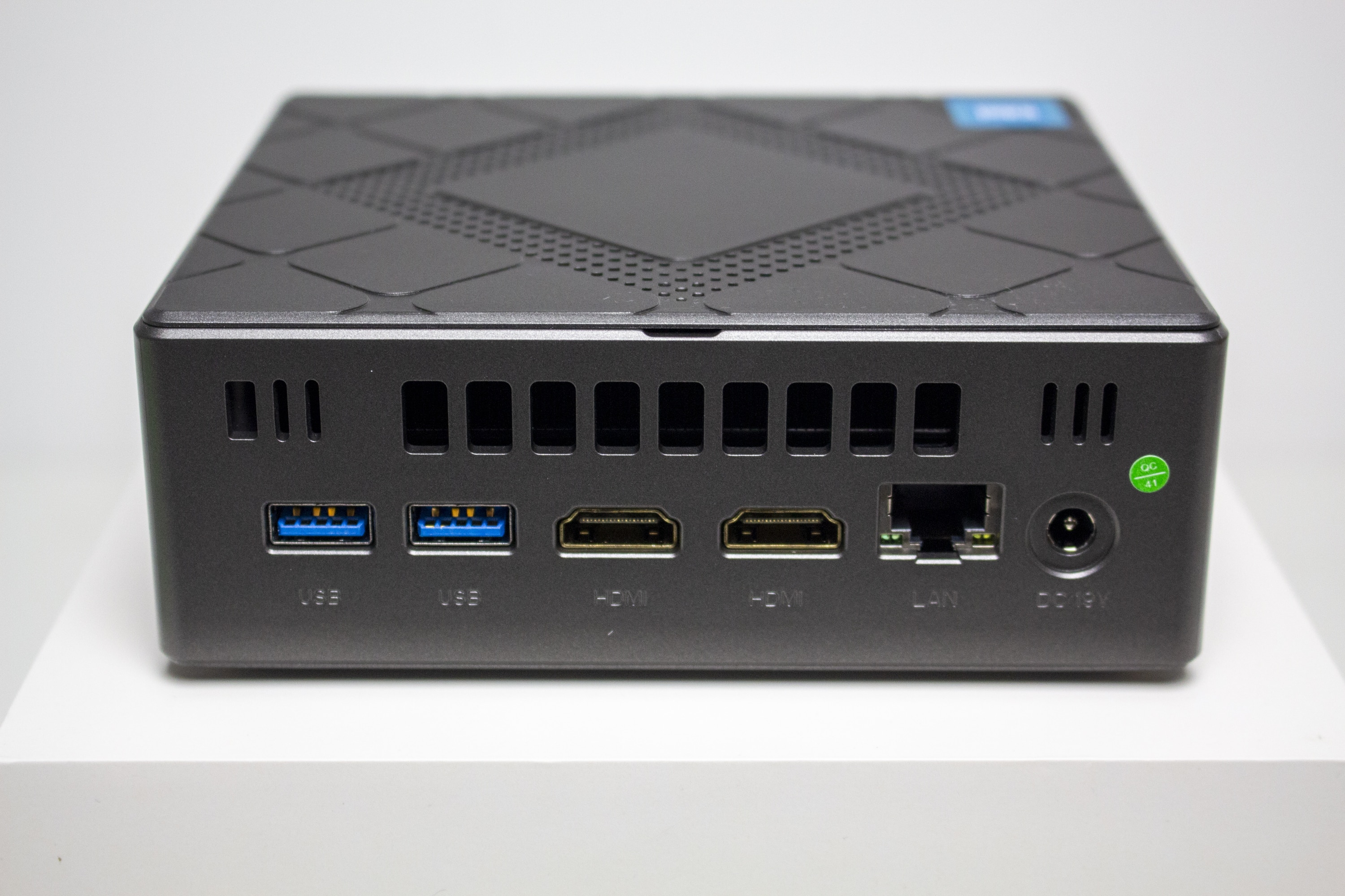 An der Rückseite stattet NiPoGi den Mini-PC mit zwei HDMI-Buchsen (jeweils 4K@60Hz), zwei weiteren USB-A-Anschlüssen sowie einem Ethernet-Port mit Gigabit-LAN aus. Alle USB-Anschlüsse sind vom Typ USB 3.2 Gen2 und unterstützen somit Übertragungsraten von bis zu 10Gbits/s. Außerdem finden wir an der Rückseite den Stromanschluss für das externe 65W-Netzteil.