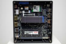 Sehr löblich sind die Wartungsmöglichkeiten des CK10. Nach der Entfernung von vier Kreuzschlitz-Schrauben sowie der Wartungsklappe im Boden, hat man freien Zugriff auf die zwei RAM- und zwei m.2-Slots (1x NVMe, 1x SATA). An der Wartungsklappe lässt sich zudem eine 2,5″-SSD anbringen. Zur Reinigung des CPU-Kühlers kann die Platine auch vollständig ausgebaut oder der Gehäusedeckel abgenommen werden.