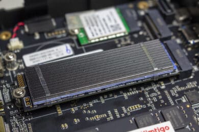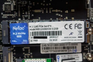 Das vorinstallierte Windows 11 Pro wurde auf einer PCIe 3.0 NVMe-SSD von Netac installiert, die mit einer Kapazität von 512GB spezifiziert wurde und dem Format m.2 2280 entspricht. Weiterhin hat der Hersteller die SSD mit einem kleinen Kühlkörper ausgestattet, um die Temperatur im grünen Bereich zu halten. Nach der Entfernung von zwei Gummibändern ist der Kühlkörper demontierbar.