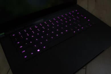 Ein Hingucker bleiben das beleuchtete Razer-Logo auf der Rückseite des Displays und die grünen USB-Anschlüsse, genau wie die frei konfigurierbare RGB-beleuchtete Tastatur.