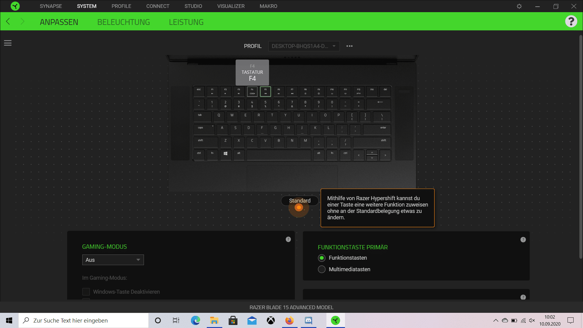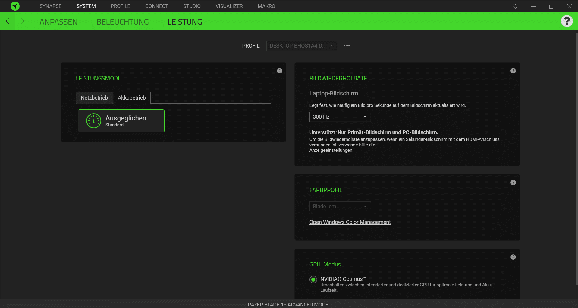 Die Software des Blade 15 Advanced ist auch immer noch Razer Synapse geblieben, wie auch schon beim Test des Razer Blade 15 Basis (2019). Nutzer von Peripherie-Geräten des Herstellers kennen diese Software auch. Über Razer Synapse kann die RGB-Beleuchtung frei konfiguriert werden. Außerdem können verschiedene Leistungs-Modi gewählt werden, die euch entweder mehr Prozessor- oder Grafikleistung gewähren.