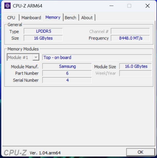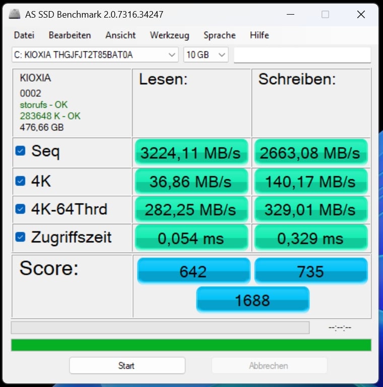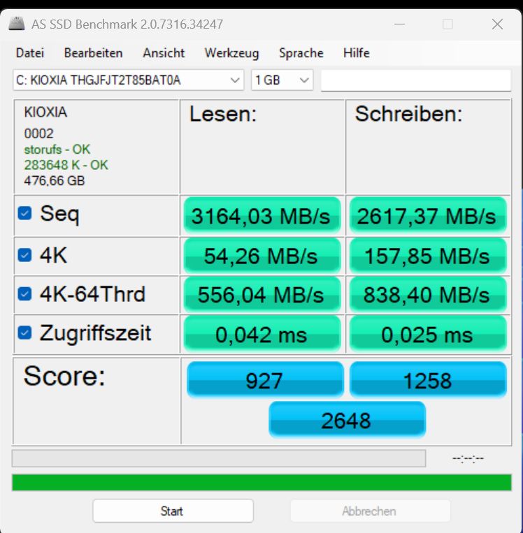 Die Geschwindigkeiten sind nahezu identisch mit der PCIe 4.0 x-4 SSD, die im Intel-Modell zum Einsatz kam. Mit rund 3.164 MB/s lesend und 2.617 MB/s schreibend liefert der Speicher eine gute, alltägliche Leistung ab. Allerdings zeigt er sich bei der 4K- und 4K-64Thrd-Leistung etwas schwachbrüstig, was gerade grafikintensive Anwendungen und Games wichtig ist. Ist aber ohnehin nicht das Steckenpferd der Snapdragon X-Prozessoren, wie wir später noch sehen werden.