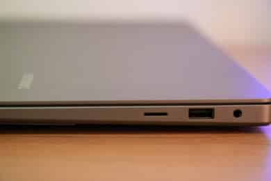 Rechts finden wir einen microSD-Kartenleser mit guten Geschwindigkeiten, einen USB-A 3.2 Gen 1-Anschluss und einen kombinierten 3,5-mm-Klinkenanschluss für die Verwendung von Kopfhörern, Headsets, Mikrofonen oder Lautsprechern.