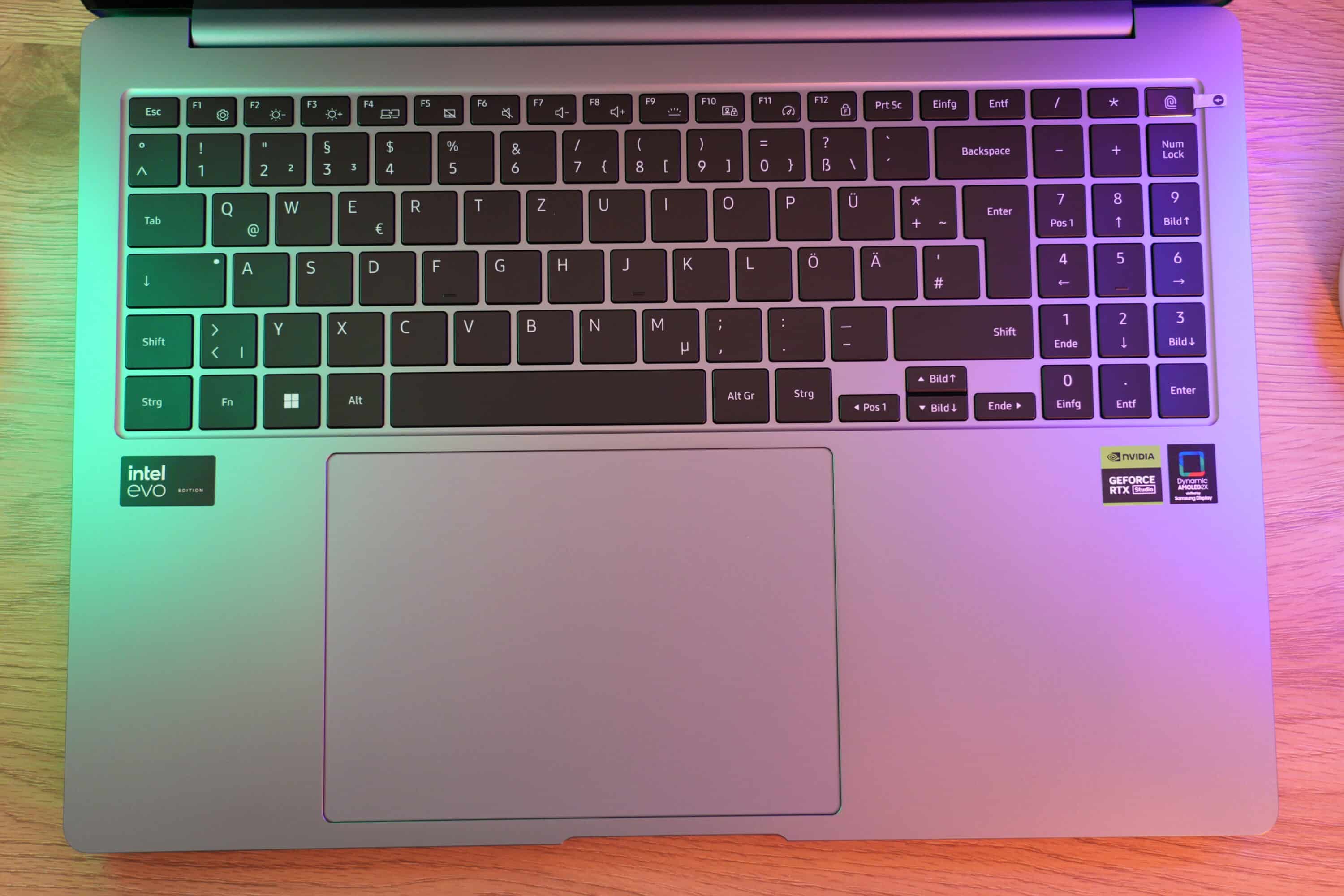 Anders verhält es sich mit dem großzügigen,15 cm x 10,8 cm großen Trackpad, das leicht nach links versetzt ist, hervorragende Gleiteigenschaften bietet und daher eine Maus recht gut ersetzen kann. Samsung verbaut zudem auch hier einen Fingerabdrucksensor im Power-Button. Außerdem gibt es eine weiße Hintergrundbeleuchtung, die in drei Helligkeitsstufen angepasst werden kann.
