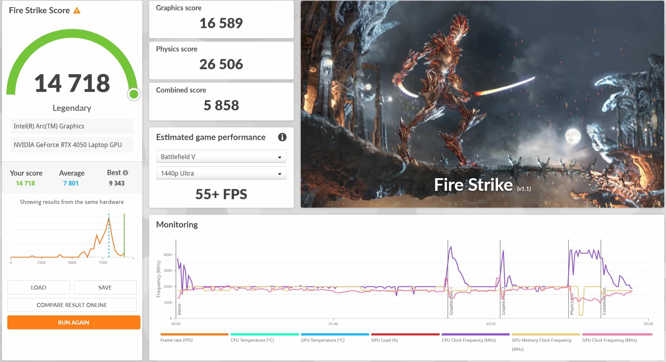 Das ist natürlich der Bereich, in dem sich die RTX 4050 wirklich bemerkbar macht. In alltäglichen Aufgaben kommt die Intel Arc iGPU zum Einsatz, in Spielen und anspruchsvollen Apps greift dann automatisch die NVIDIA-GPU ein.