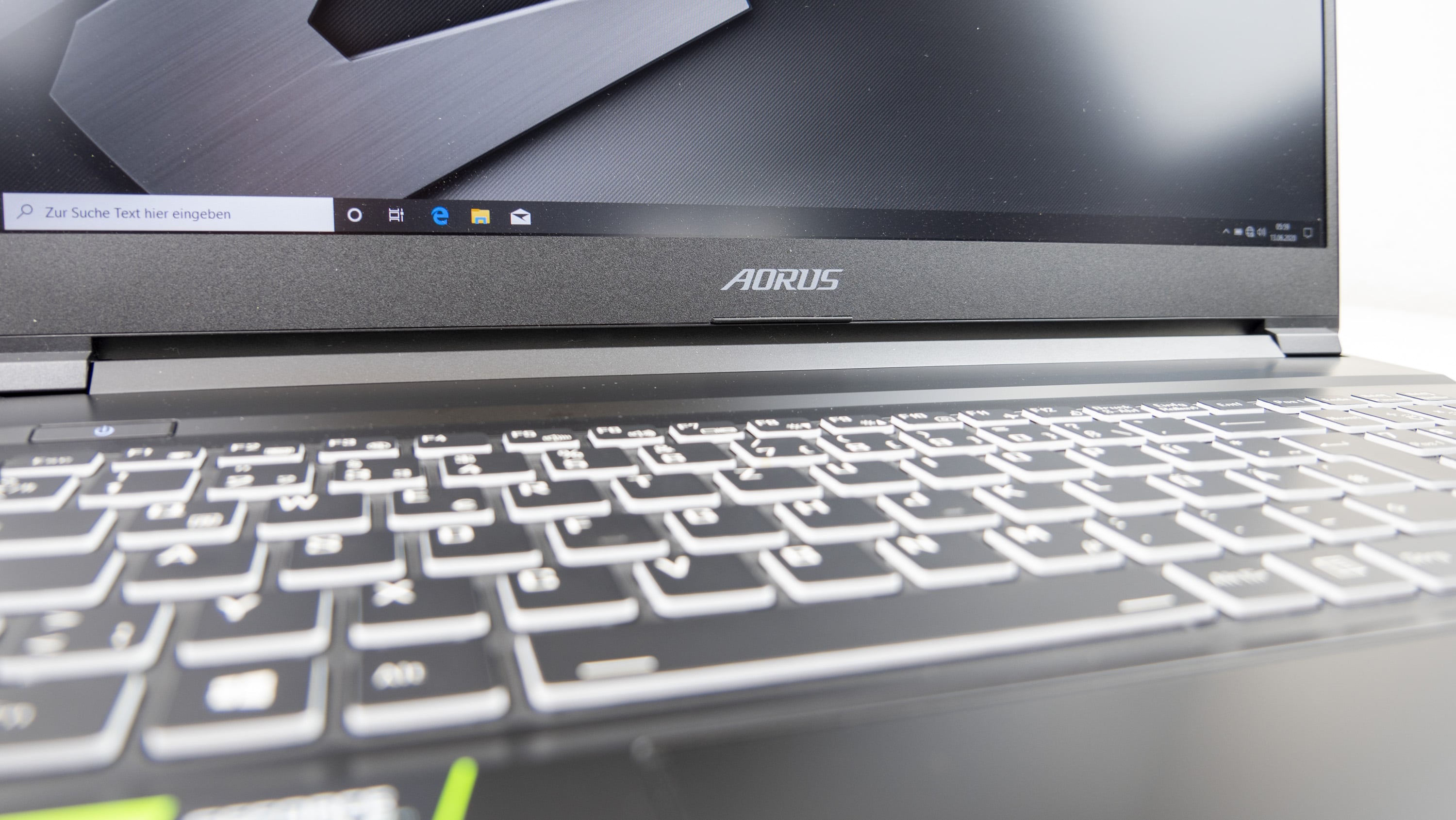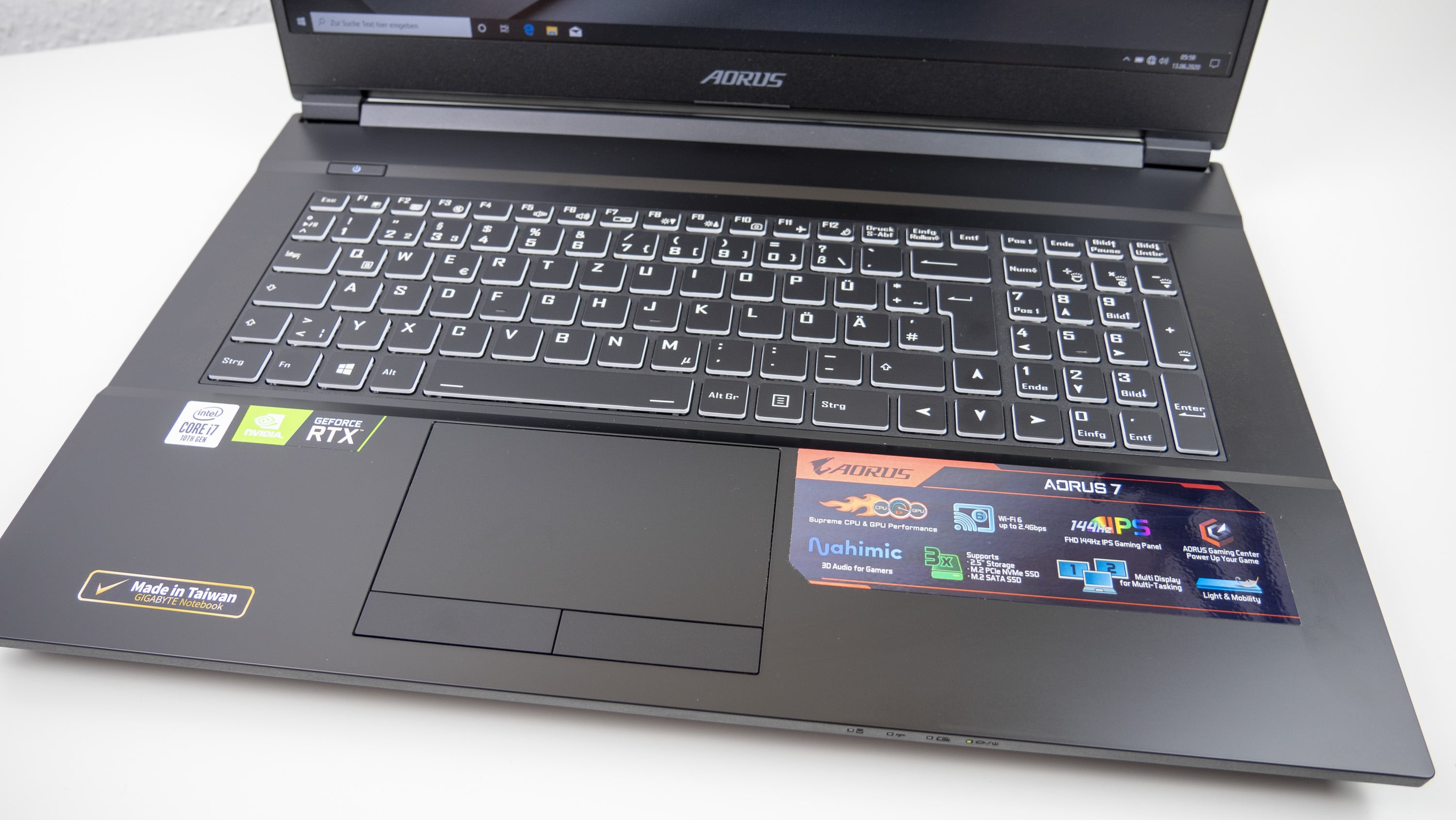 In Sachen Tatstatur setzt Gigabyte auf Chiclet. Diese überzeugt beim Aorus 7 vor allem durch ein optimales Feedback. Der angenehme Druckpunkt macht das Notebook nicht nur zur Gaming-Maschine, sondern erlaubt durchaus auch die ein oder andere Schreibpartie. Sicherlich sorgt allen voran die RGB-Beleuchtung dafür, dass die Tastatur bereits beim ersten Blick ins Auge springt. Allerdings muss man hierbei durchaus Abstriche gegenüber High-End-Gaming-Notebooks machen. Für den Otto-Normal-Verbraucher reicht diese aber auf jeden Fall aus. So kann der Nutzer neben der Farbe auch die Helligkeit der Beleuchtung einstellen. Die gesonderte Beleuchtung einzelner Tasten ist jedoch nicht möglich. Dennoch überzeugt die RGB-Beleuchtung durch ein schönes gleichmäßiges Bild.
