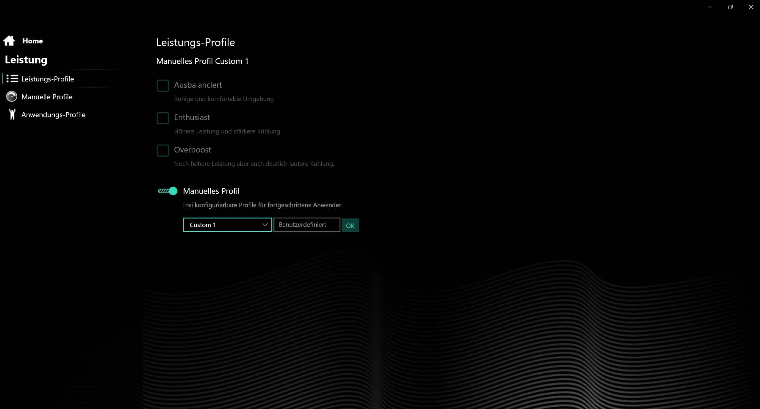 Außerdem kann innerhalb der Software das Leistungsprofil angepasst werden. Grundsätzlich stehen hier drei Profile zur Wahl: Ausbalanciert für einen besonders ruhigen Betrieb, Enthusiast für höhere Leistung und Overboost für die maximale Leistung – aber auch die höchste Lautstärke.