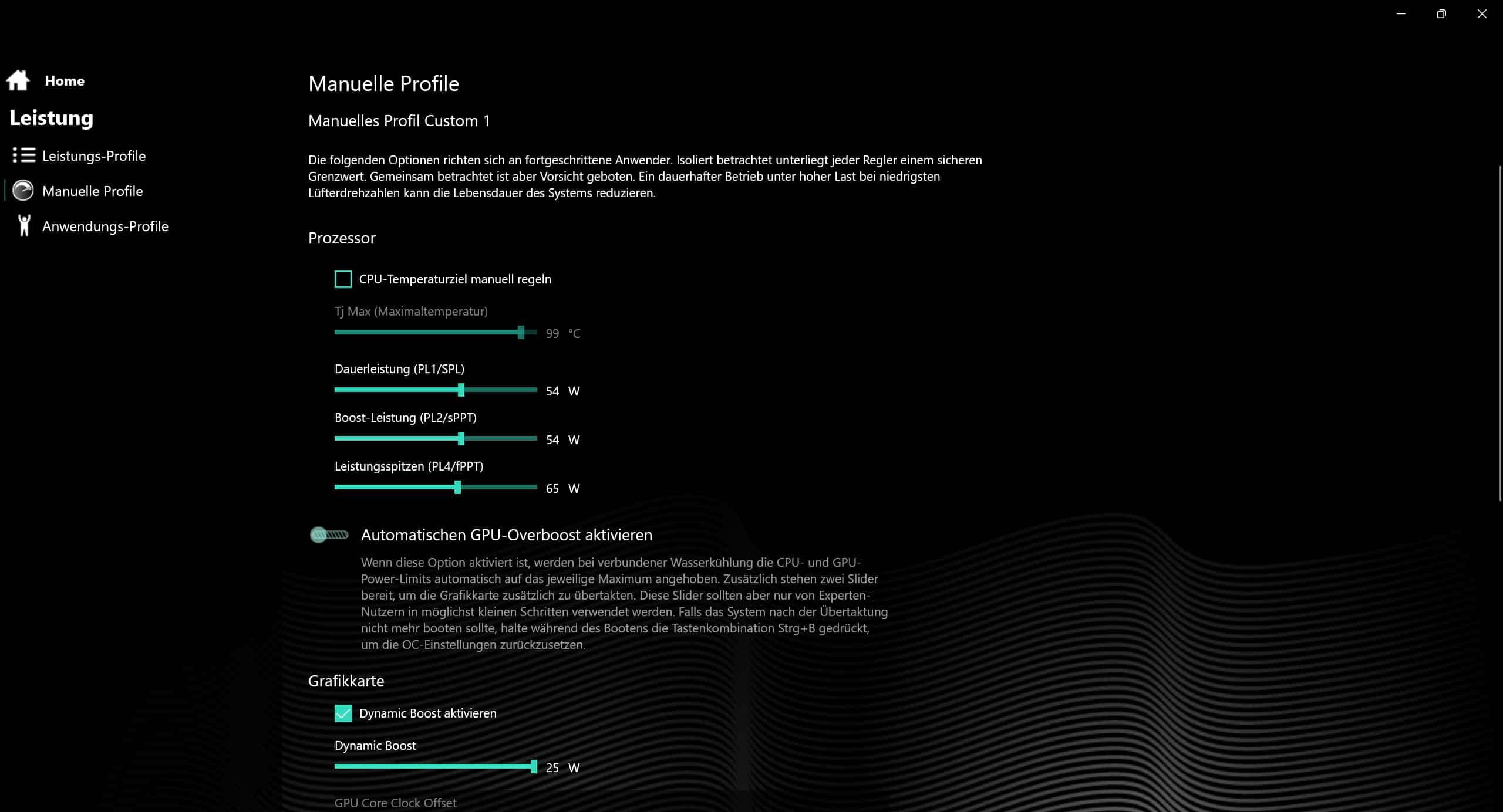 Wer mag kann darüber hinaus eigene manuelle Profile anlegen und darin sämtliche Parameter frei Einstellungen. Von der CPU-Dauerleistung bis hin zum GPU-Overboost und vieles mehr.