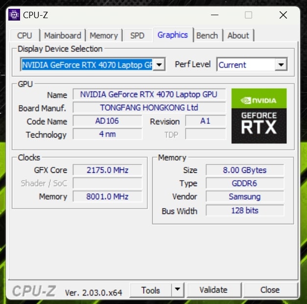 | Grafikleistung | Nvidia GeForce RTX 4070 (8GB GDDR6 VRAM); 140 W TDP |