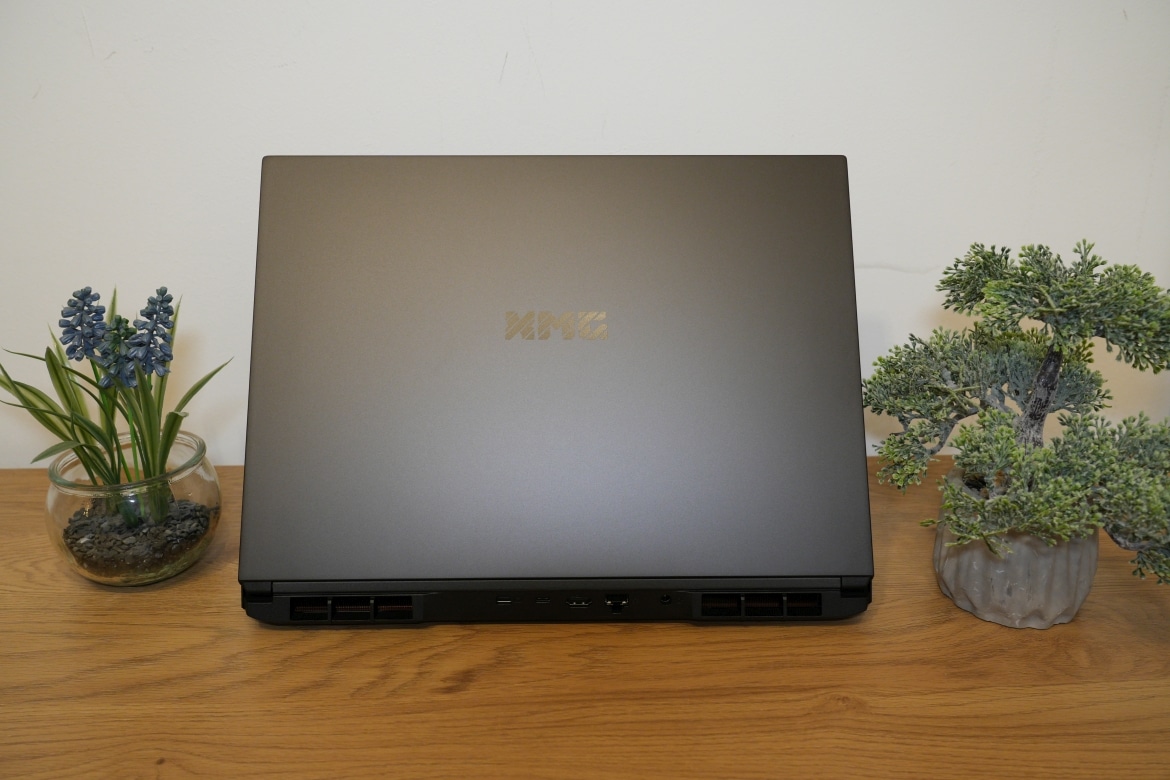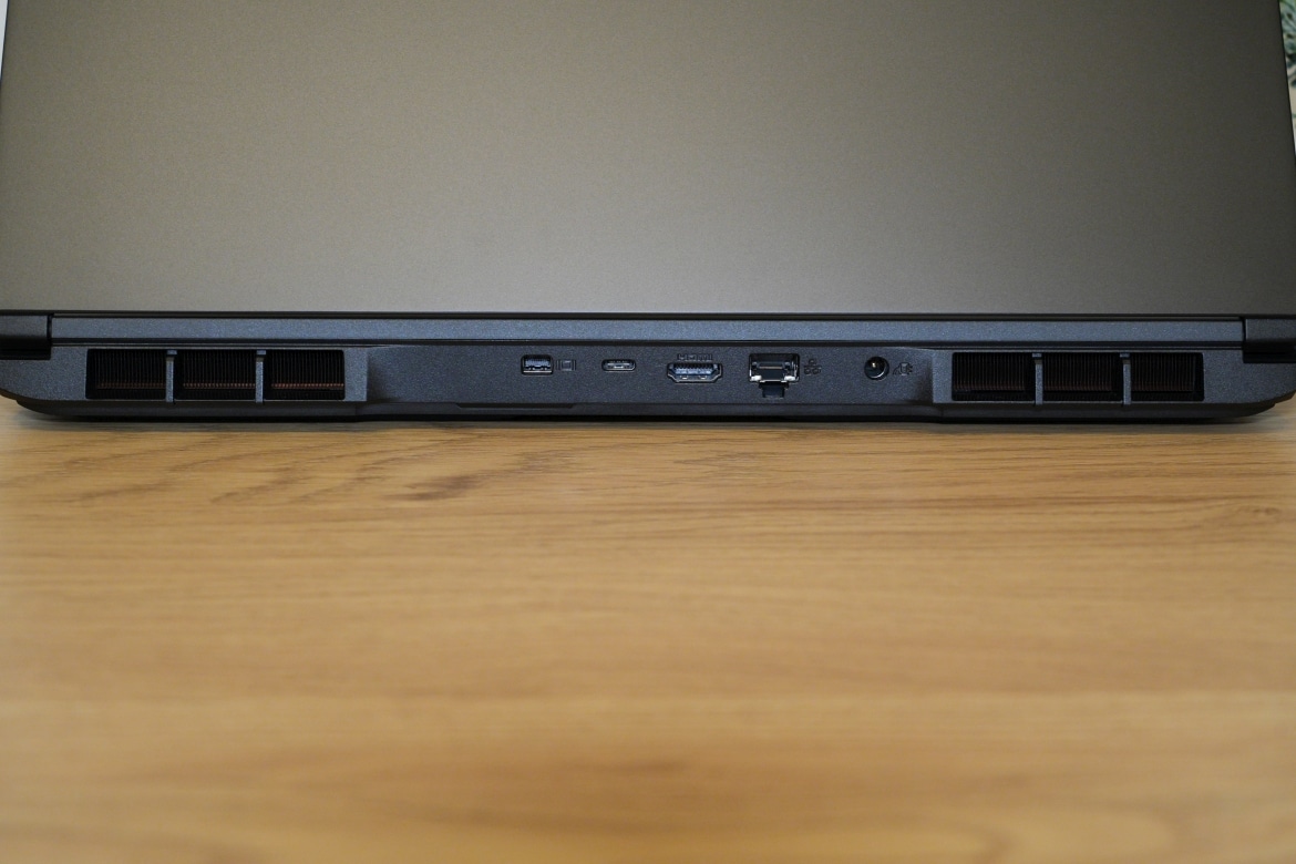 Die Anschlüsse verteilt das XMG Core 16 L23 auf insgesamt drei Seiten. Hinten finden wir den Netzanschluss, RJ45-Gigabit-LAN, HDMI 2.1 (G-SYNC kompatibel), einmal USB-C 3.2 Gen 2×1, sowie Mini DisplayPort 1.4a (ebenfalls G-SYNC kompatibel).