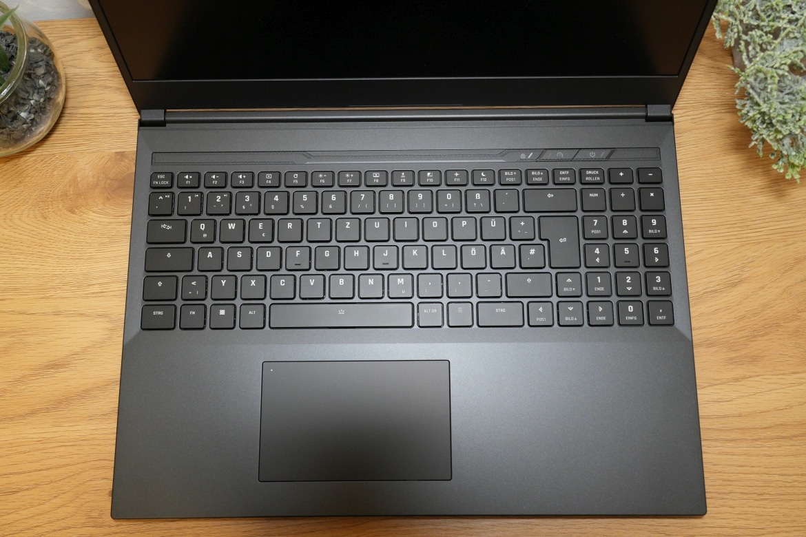 Ebenfalls gut fällt das Touchpad aus, das mit einer Größe von 115 mm x 70 mm (Breite x Höhe) angenehm viel Platz bietet und mit tadellosen Gleiteigenschaften punktet. Es ist zudem leicht nach links versetzt, was vor allem Rechtsändern bei der WASD-Steuerung sehr gut gefallen dürfte.
