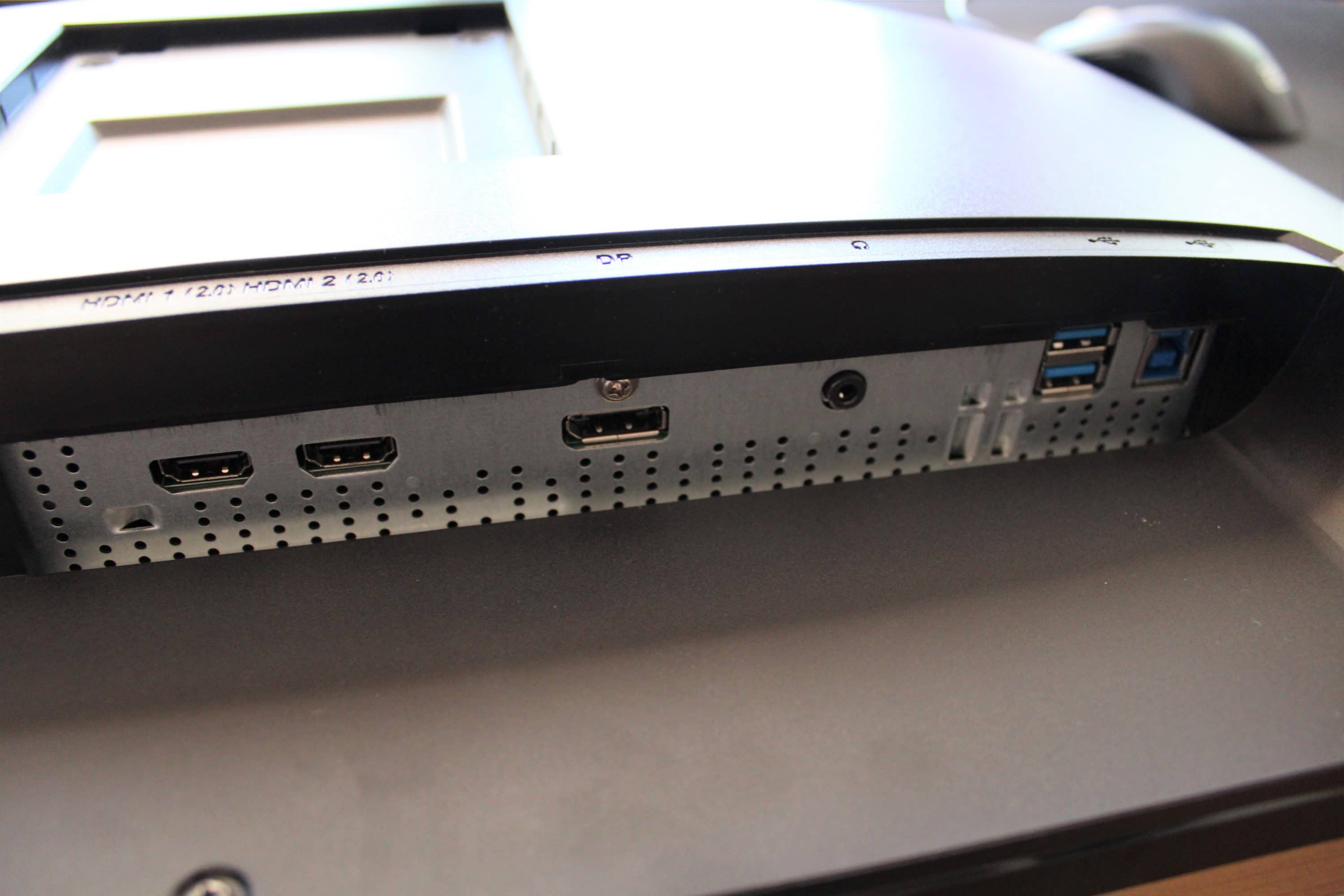 Der Monitor verfügt über zwei HDMI-Anschlüsse und einen DisplayPort-Anschluss, einen USB-3.0-Hub mit 4 USB-Ports (zwei hinten und zwei seitlich), einen 3,5-mm-Klinkenanschluss und integrierte Lautsprechern. Im Vergleich zum XF0 ist demnach der DVI und ein Klinkenanschluss weggefallen, jedoch für die meisten Nutzer sicherlich nicht störend.