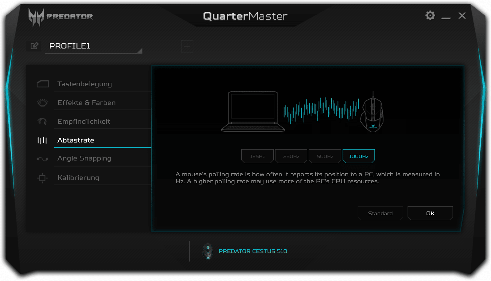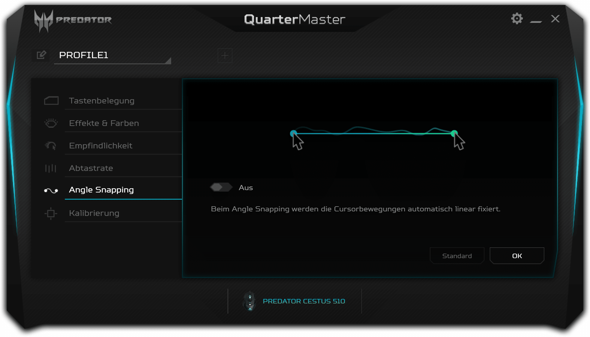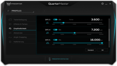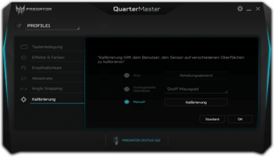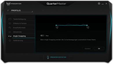 Wie heutzutage üblich, gibt es auch für die Cestus 510 eine passende Software. Die Konfiguration erfolgt über Acers produktübergreifendes Quartermaster-Tool, das schnell und ohne Registrierungszwang installiert werden kann. Die Software ist in schwarz, grau und türkis gehalten und hat ein modernes UI.