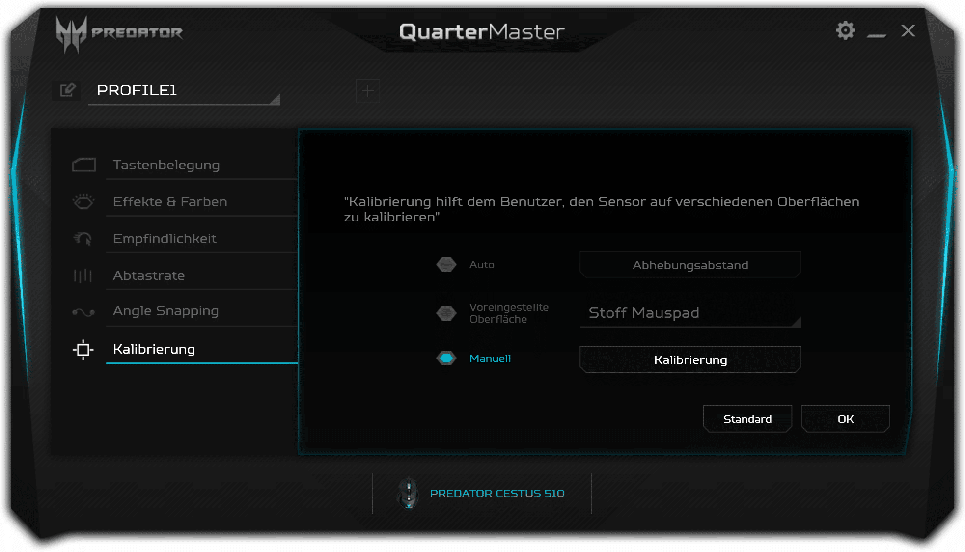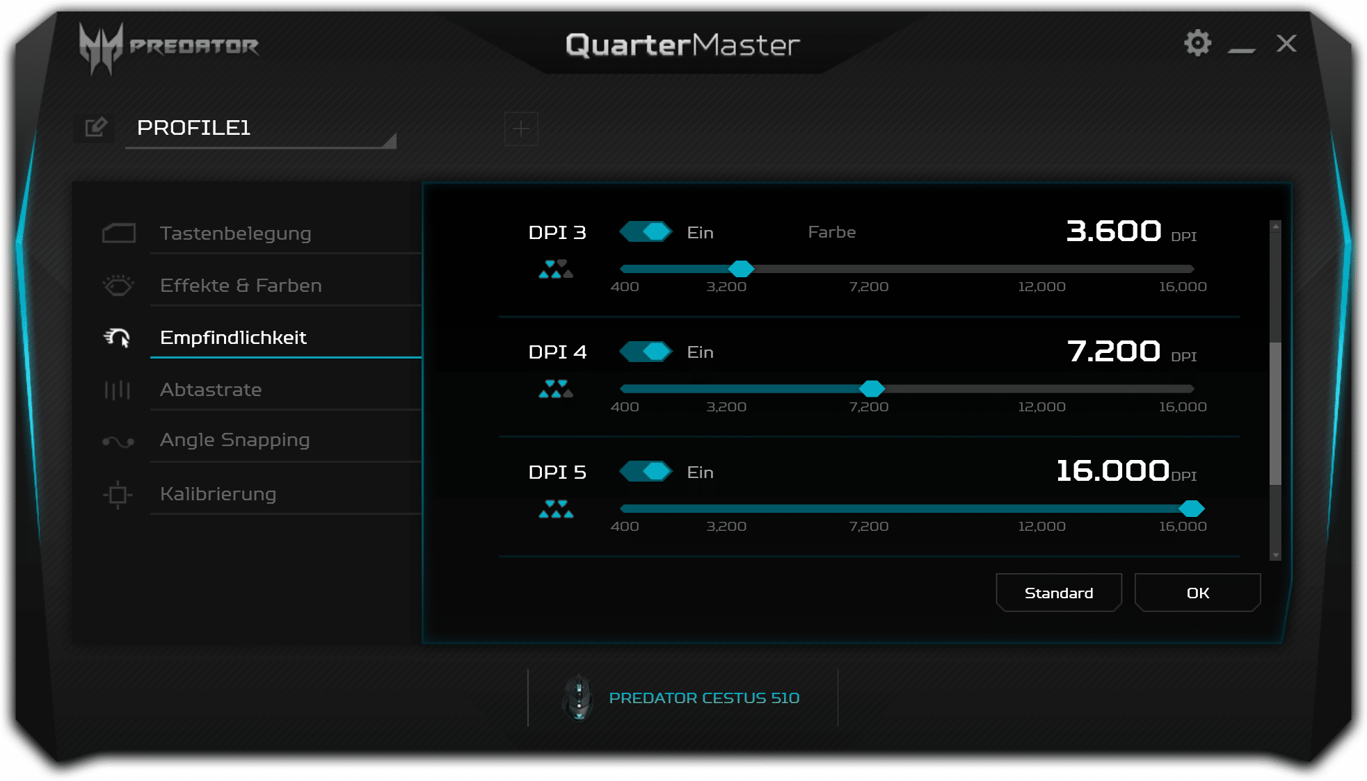 Die Konfiguration des Sensors ist über die folgenden vier Punkte der Maus verteilt. Bis zu fünf DPI-Profile stehen zur Auswahl, die in 50-DPI-Schritten im Bereich zwischen 400 und 16.000 angepasst werden können. Die folgenden Punkte beinhalten ein optionales Angle-Snapping, die Abtastrate des Sensors, eine Oberflächen-Kalibrierung sowie die Lift-Off-Distance. Damit werden alle Ansprüche an die Sensor-Konfiguration abgedeckt, sofern man von einer getrennten DPI-Einstellung pro Achse absieht.