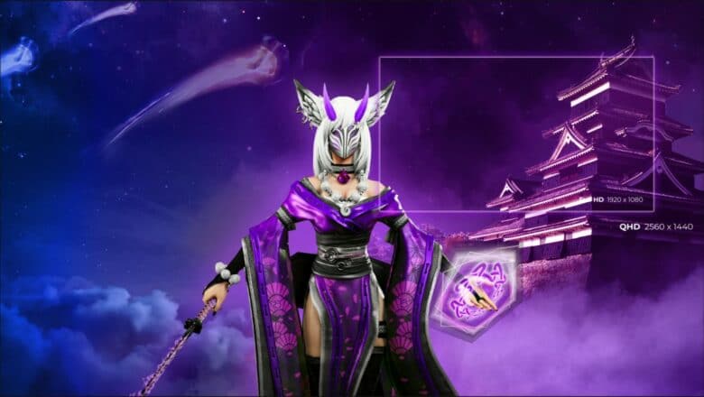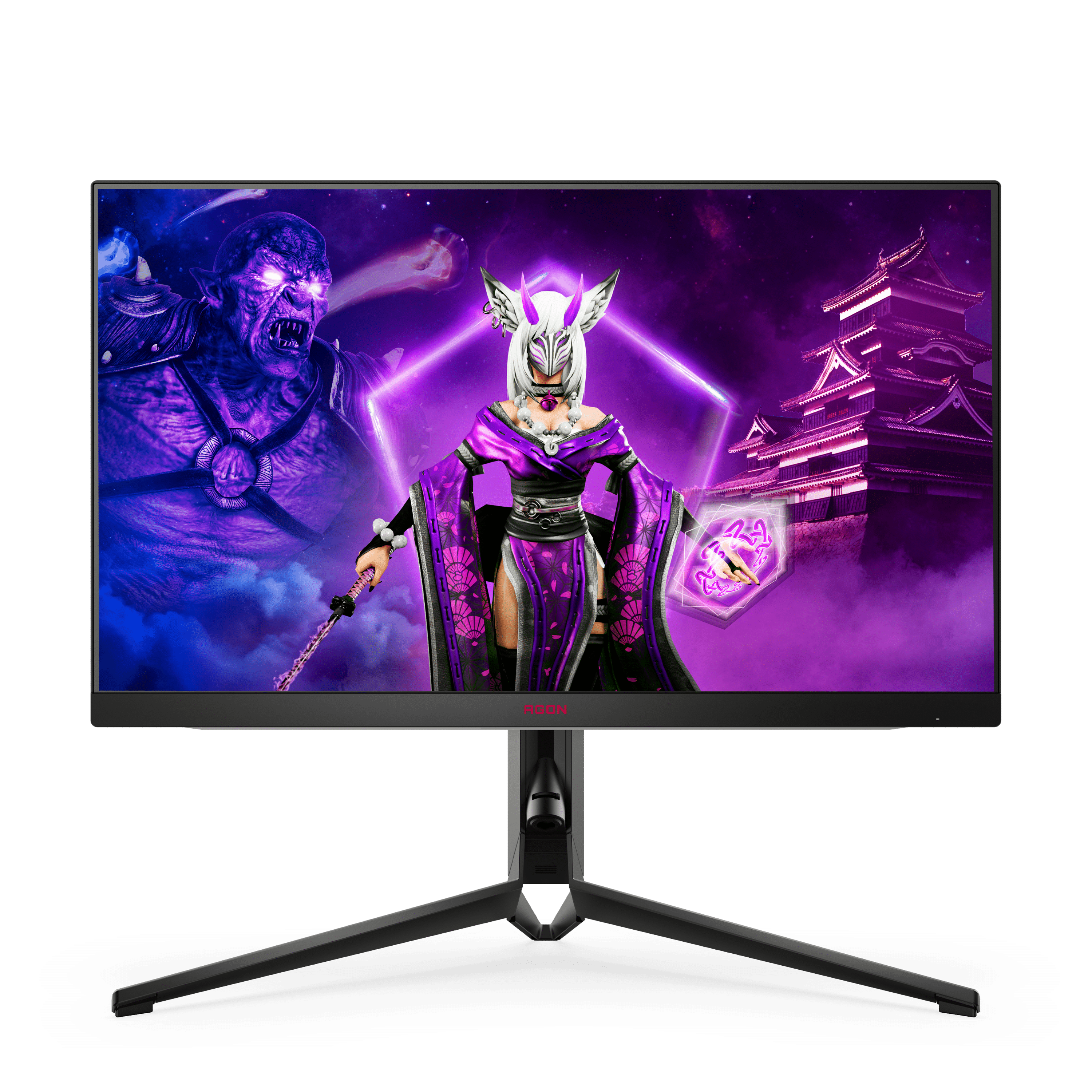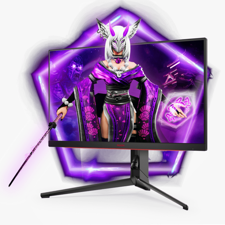 Das Design von der Website und dem Karton ist jetzt zwar eigentlich total unwichtig, aber ich finde es derart hässlich, dass ich dem ganzen doch eine Erwähnung spendieren möchte. Was die Frau im japanischen Kleid mit violetter Kuhglocke um den Hals, Christbaumkugeln ums Handgelenk, finsterer 4-Augen-Maske, leuchtenden Hörnern und Greifenohren mit Ohrringen da auf einem Highend FPS-eSport-Monitor zu suchen hat, kann ich mir beim besten Willen nur als Fehlgriff der Marketingagentur erklären. Die ganze „Aufmachung“ erinnert an vergangene Pixelzeiten und wirkt offen gesagt insbesondere neben den dutzenden „ohne Funktion XY – mit Funktion XY“-Bildern billig. Die AGON PRO-Reihe hat sicher besseres verdient.