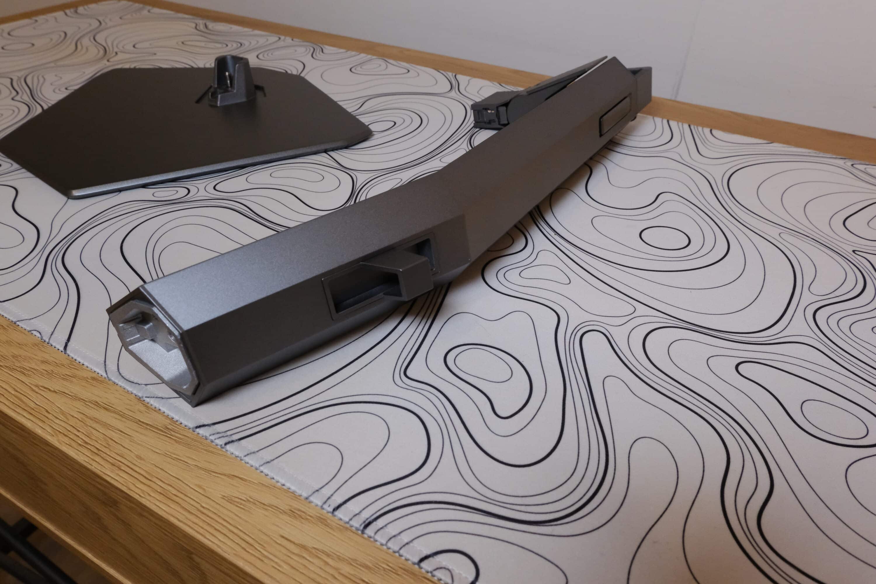 Gerade einmal rund 5,2 Kilogramm bringt der Monitor ohne Standfuß auf die Waage. Letzterer lässt sich einfach und ohne Werkzeug in nur zwei Schritten zusammenschrauben, wobei der Monitorarm eine simple Headsethalterung und eine einfach Kabelführung beinhaltet.