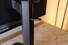 Der Standfuß weist dieselbe fünfeckige Form auf, wie die Rückseite des Monitors und wird durch insgesamt fünf Gummifüße sicher in Position gehalten. Er kommt auf eine Breite von rund 26 cm und ist maximal 23 cm tief, womit er recht viel Platz auf dem Schreibtisch einnimmt, dafür aber auch sicher und wackelfrei steht.