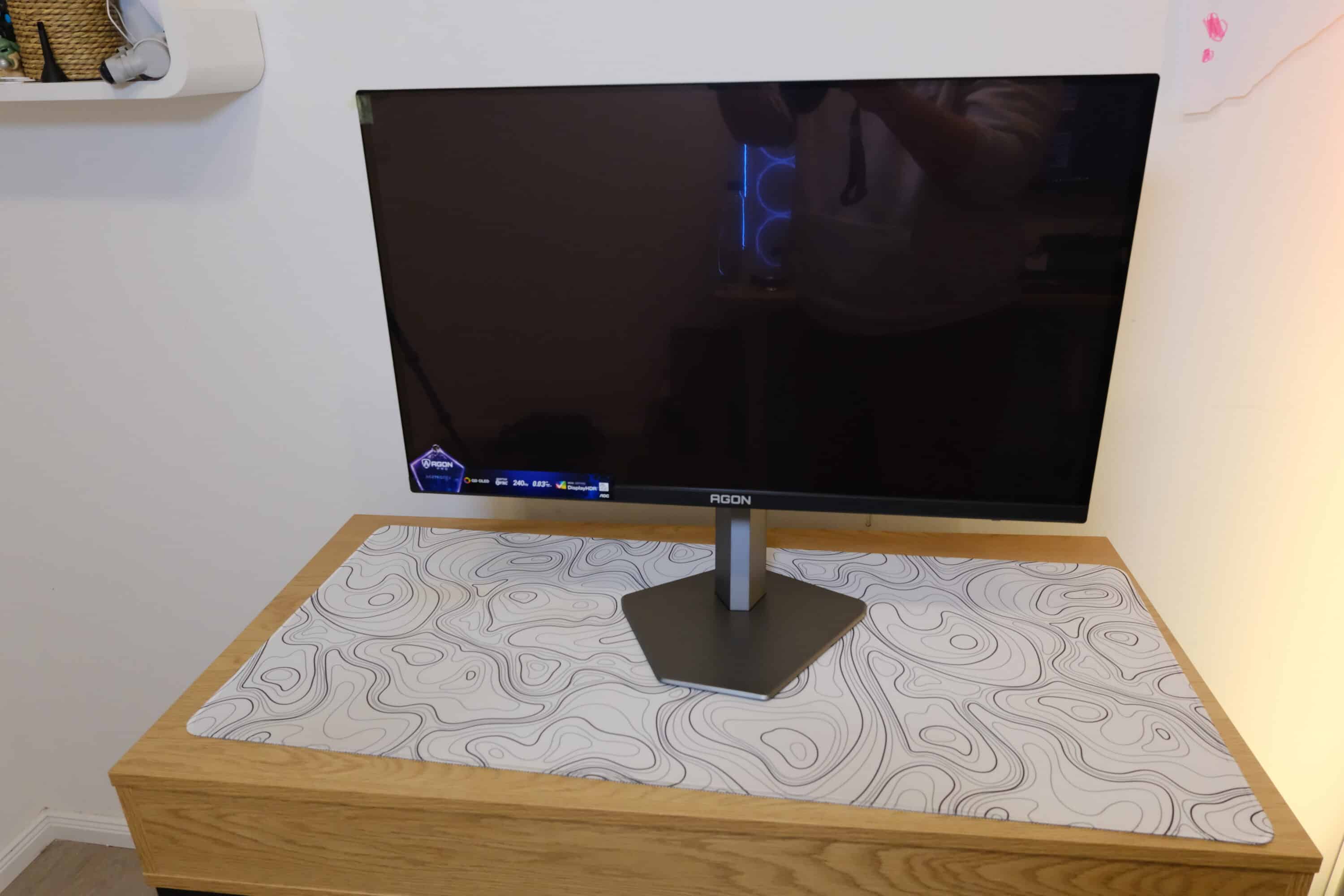 Der AOC Agon PRO AG276QZD2 setzt auf ein spiegelndes QD-OLED-Display der zweiten Generation. Dabei ist die Oberfläche derart „glossy“, dass es unmöglich ist, Fotos der Vorderseite aufzunehmen, ohne den kompletten Raum gespiegelt im Display wahrzunehmen.