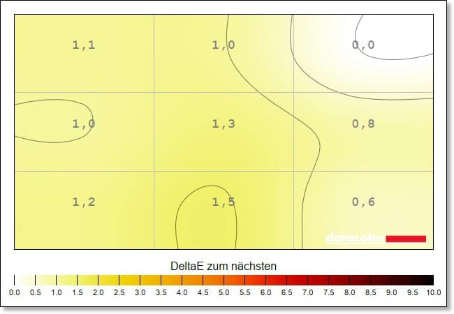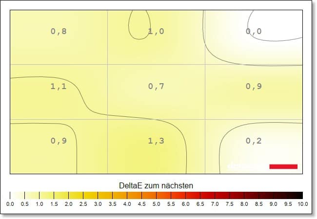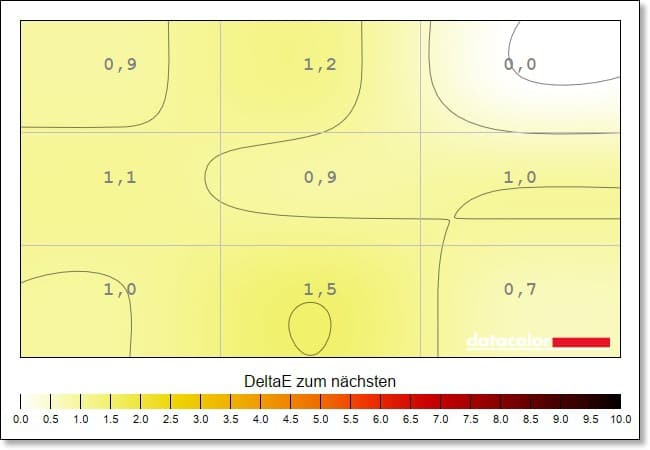 Ein beeindruckendes Ergebnis liefert der AOC Agon PRO AG276QZD2 zudem bei der Farb-Homogenität, die die Ausgeglichenheit der Farbdarstellung aufzeigt. Hier zeigen sich kaum nennenswerte Abweichungen – Werte von bis zu 10 sind dabei durchaus normal.